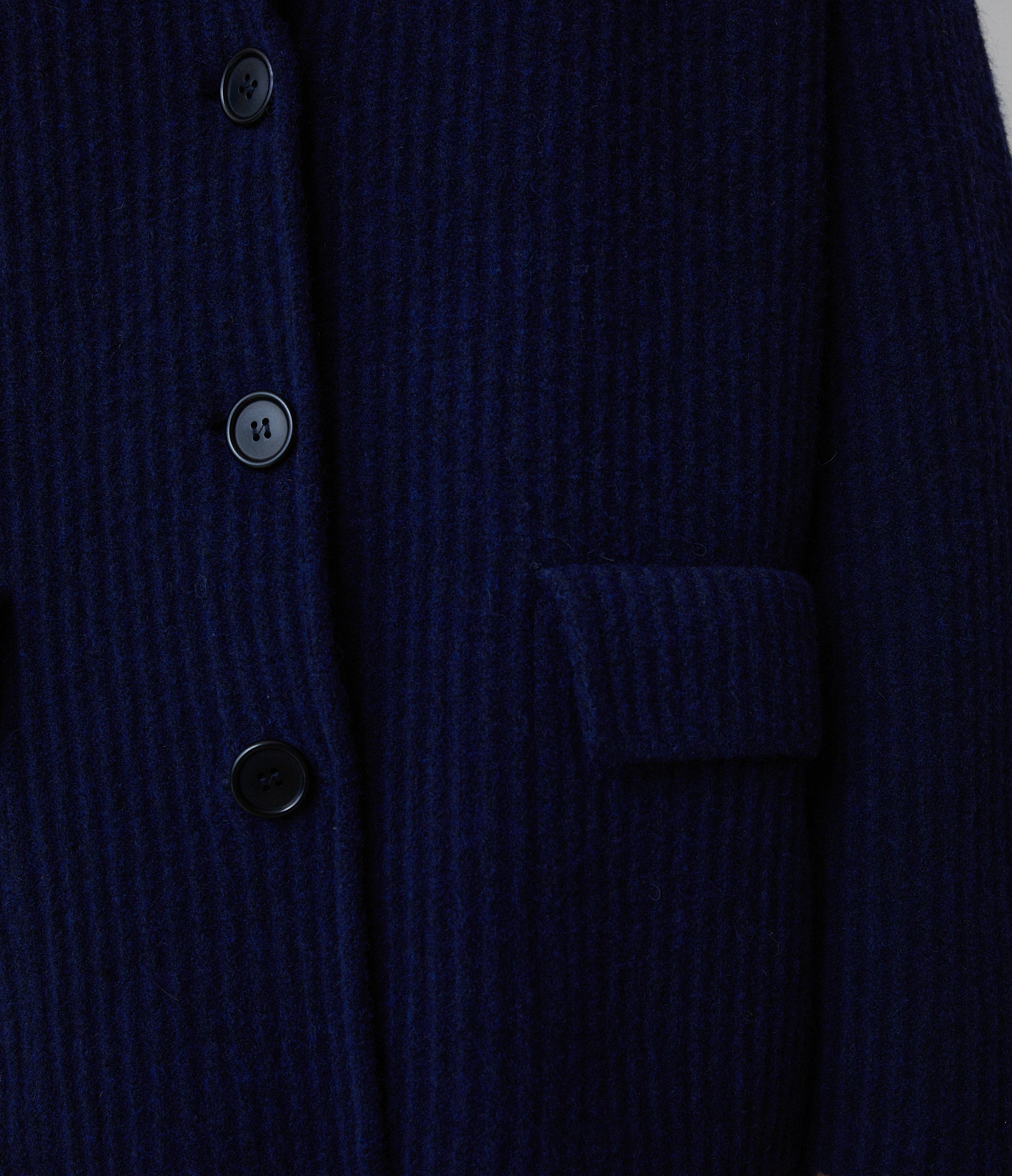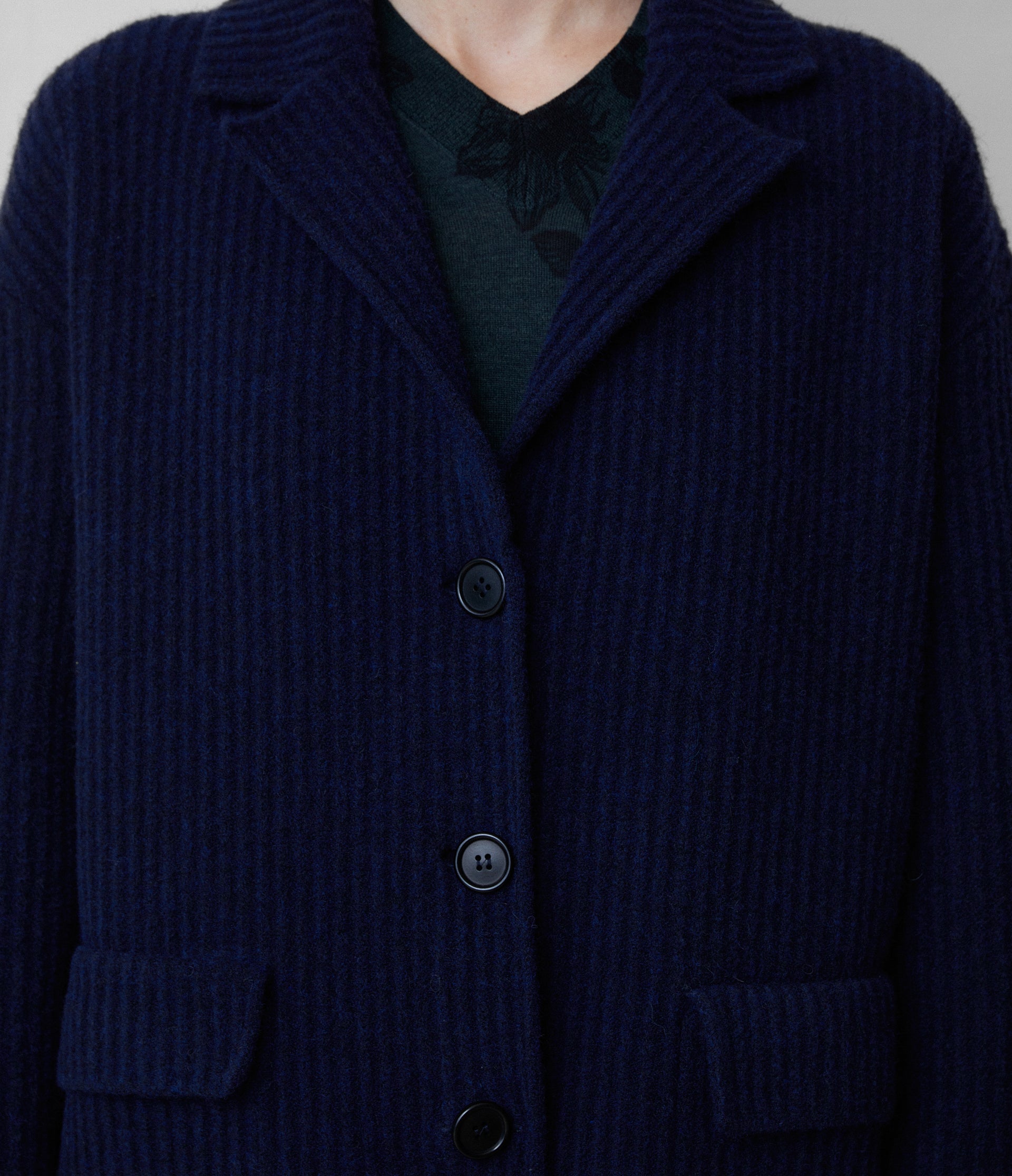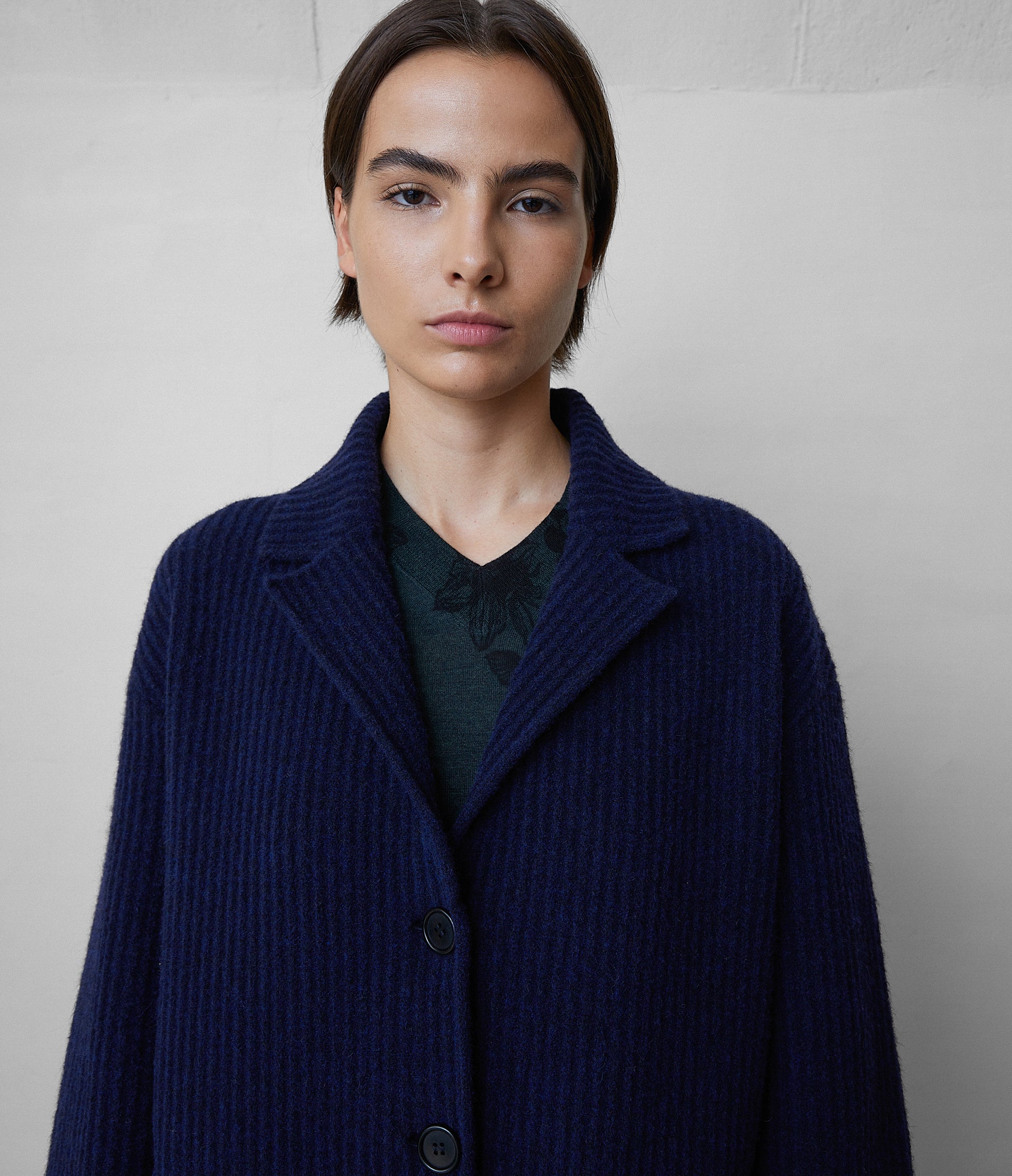 Ribbed wool coat with a lapel collar and front button closure. Front patch pockets with flaps.