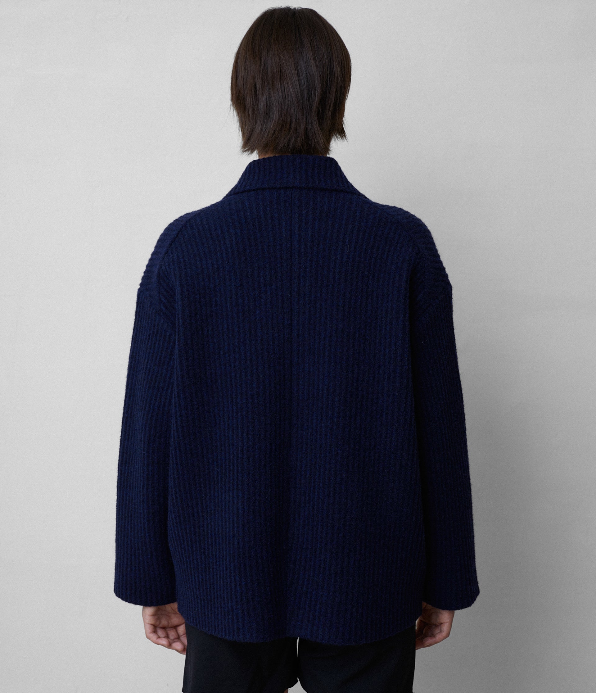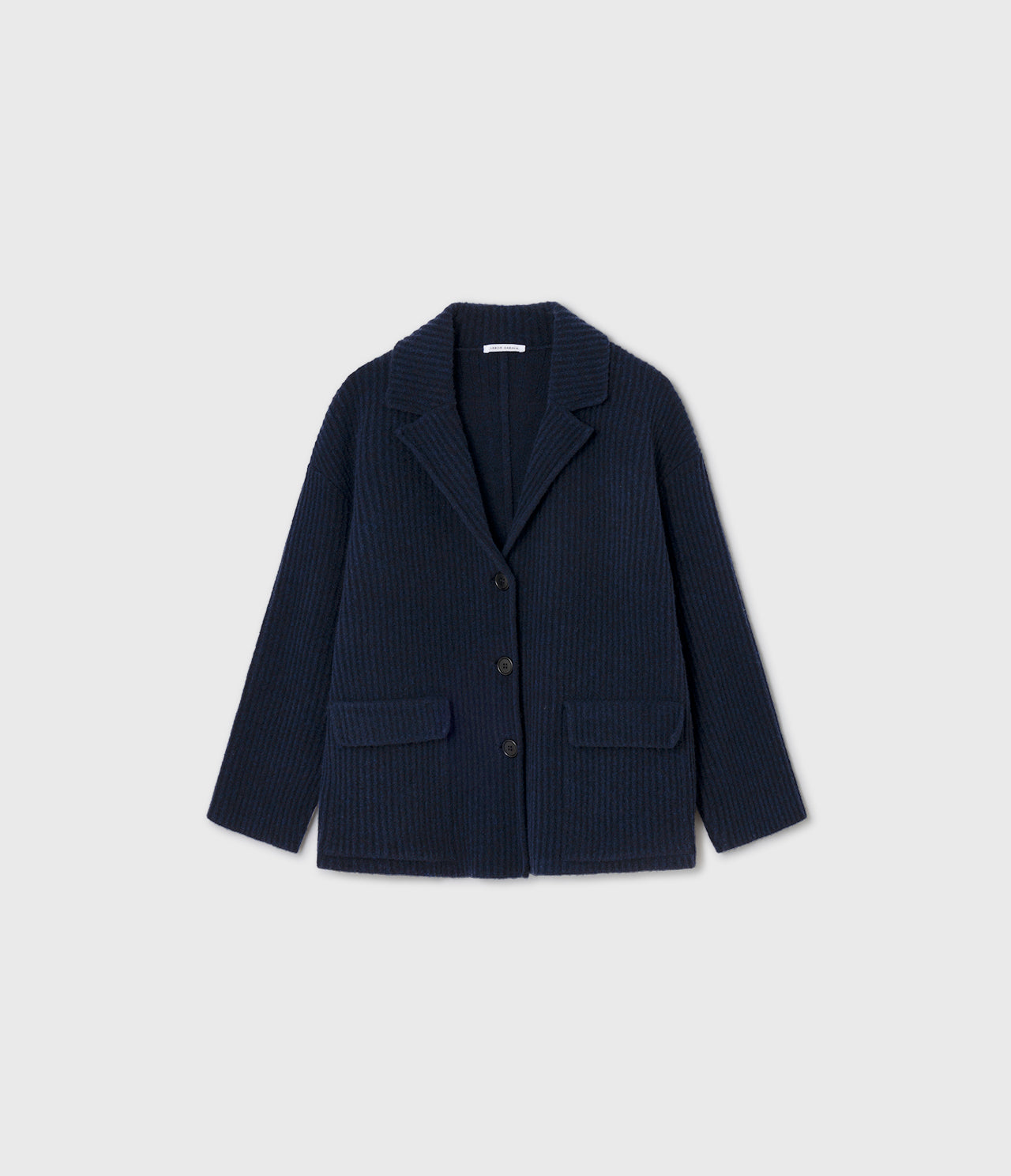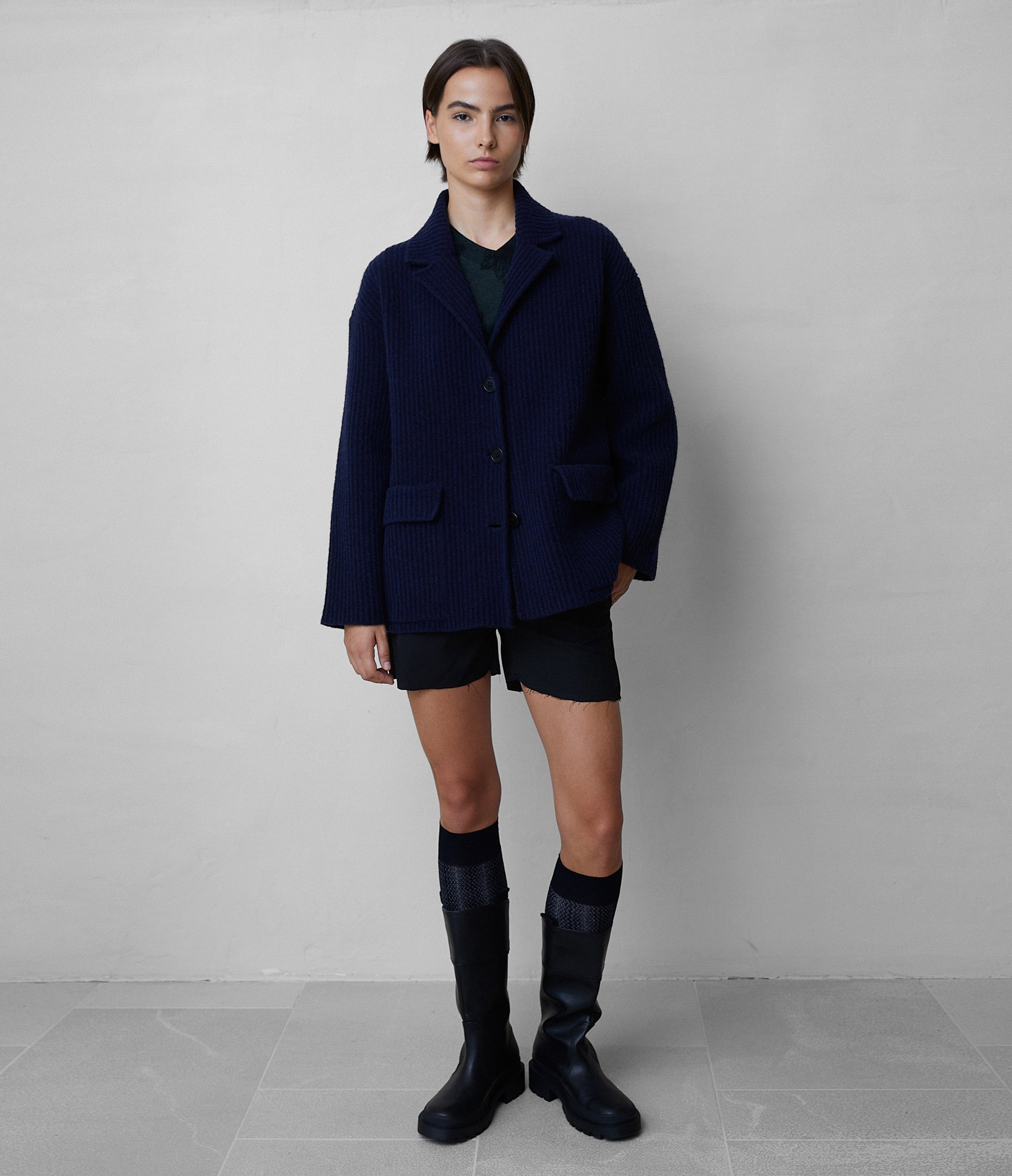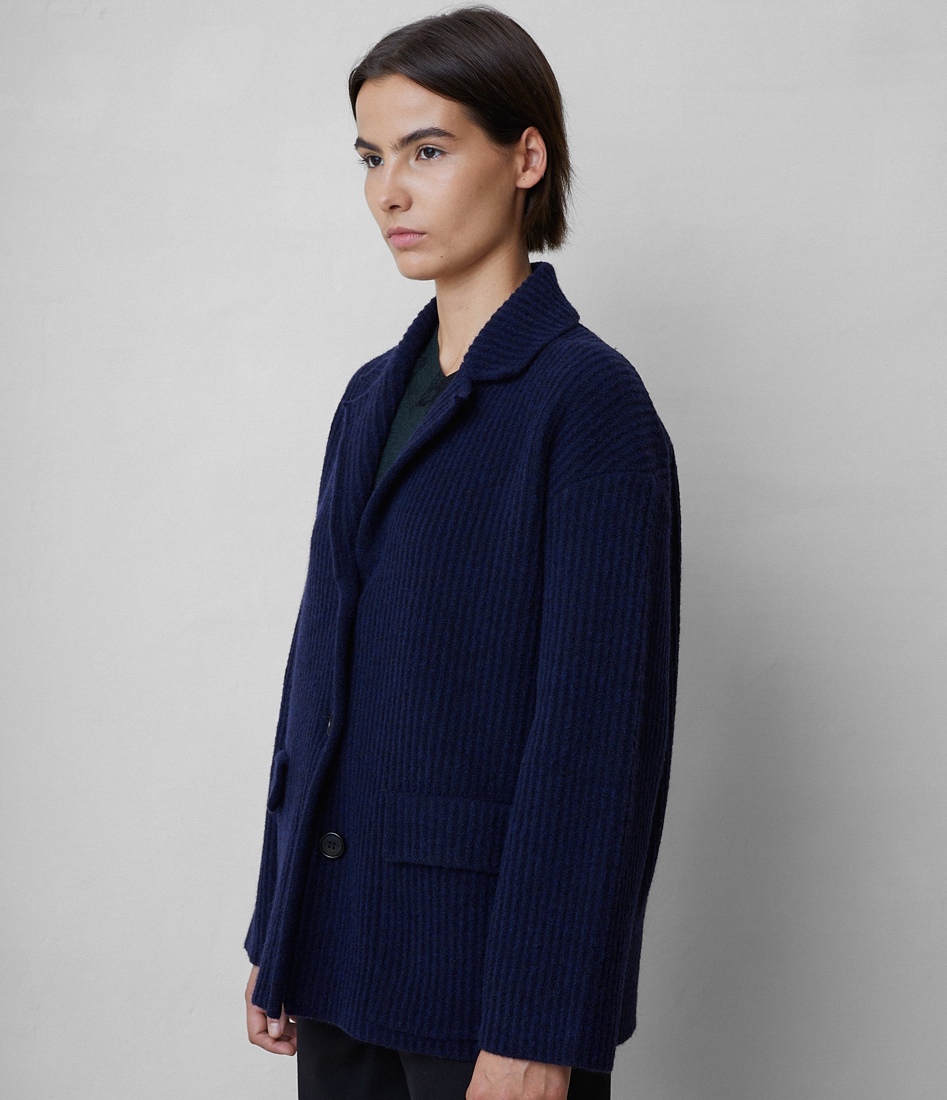 Ribbed wool coat with a lapel collar and front button closure. Front patch pockets with flaps.