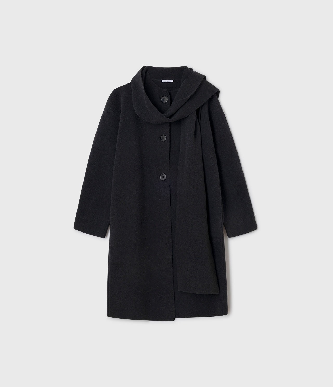 Houndstooth jacquard wool coat. Round neckline and front button closure. Attached scarf sewn at the back of the coat's collar. Side pockets.