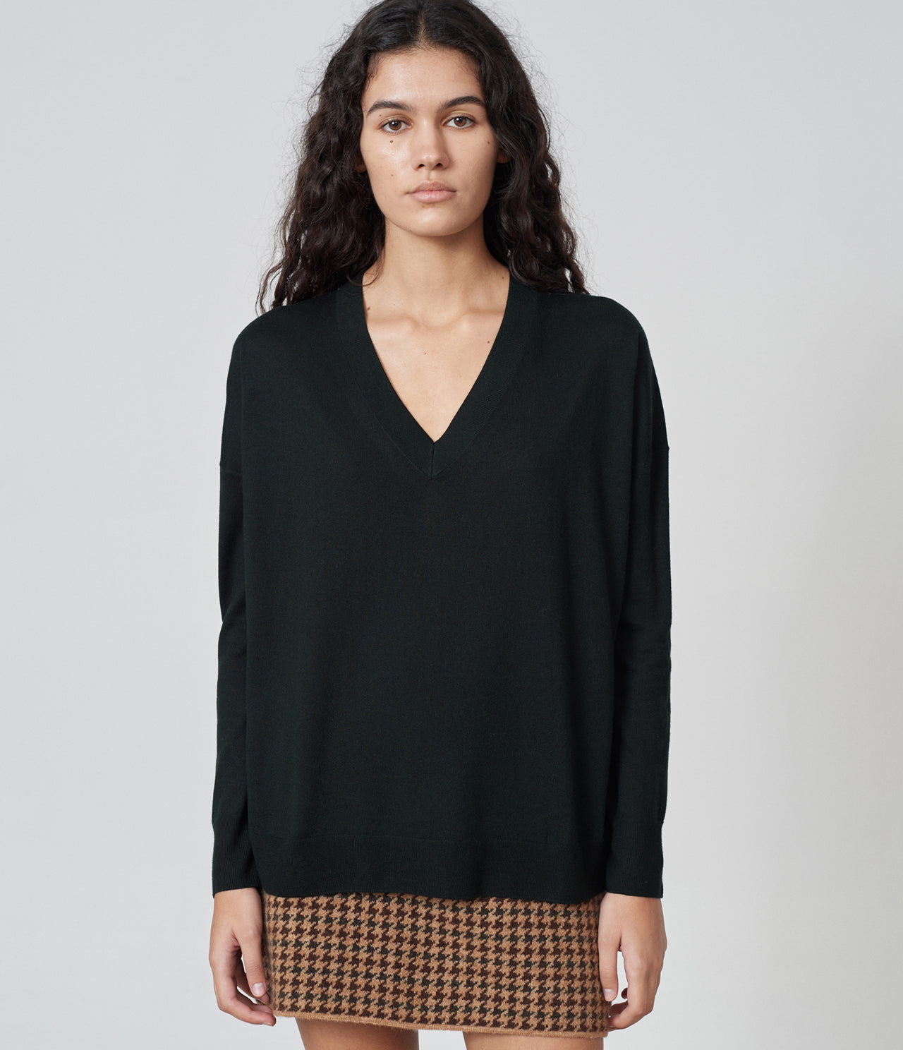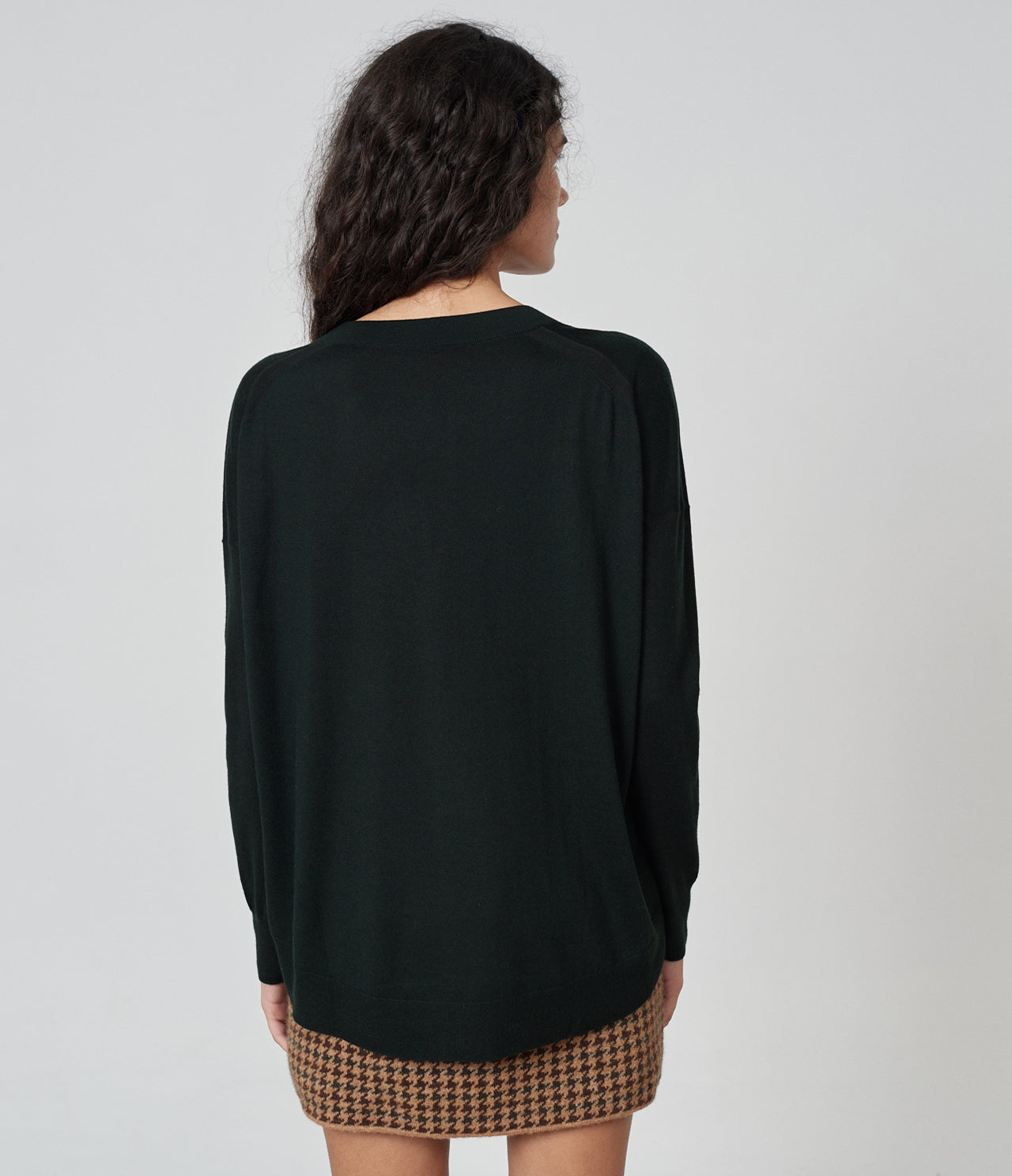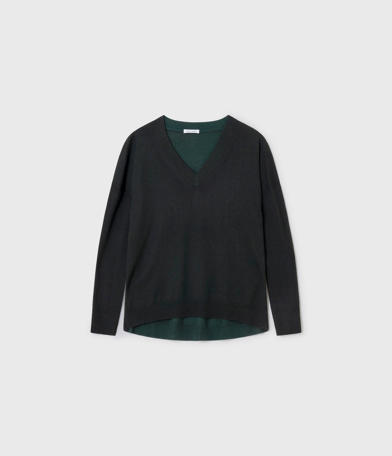 Loose knit sweater with a V-neck and long sleeves. Hem with side openings and a longer back than the front. Neckline, cuffs, and hem finished with ribbing. Color with a painted effect.