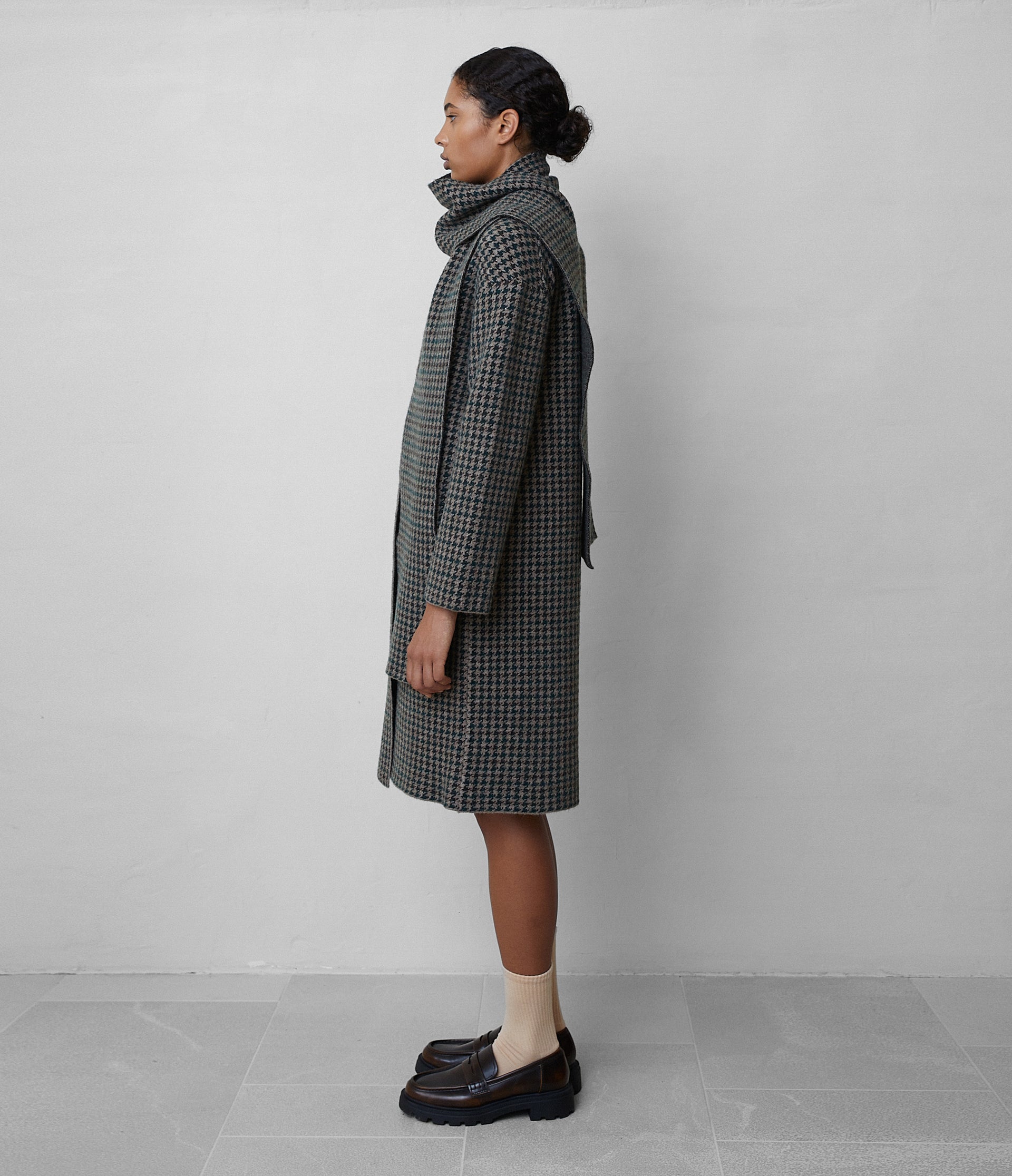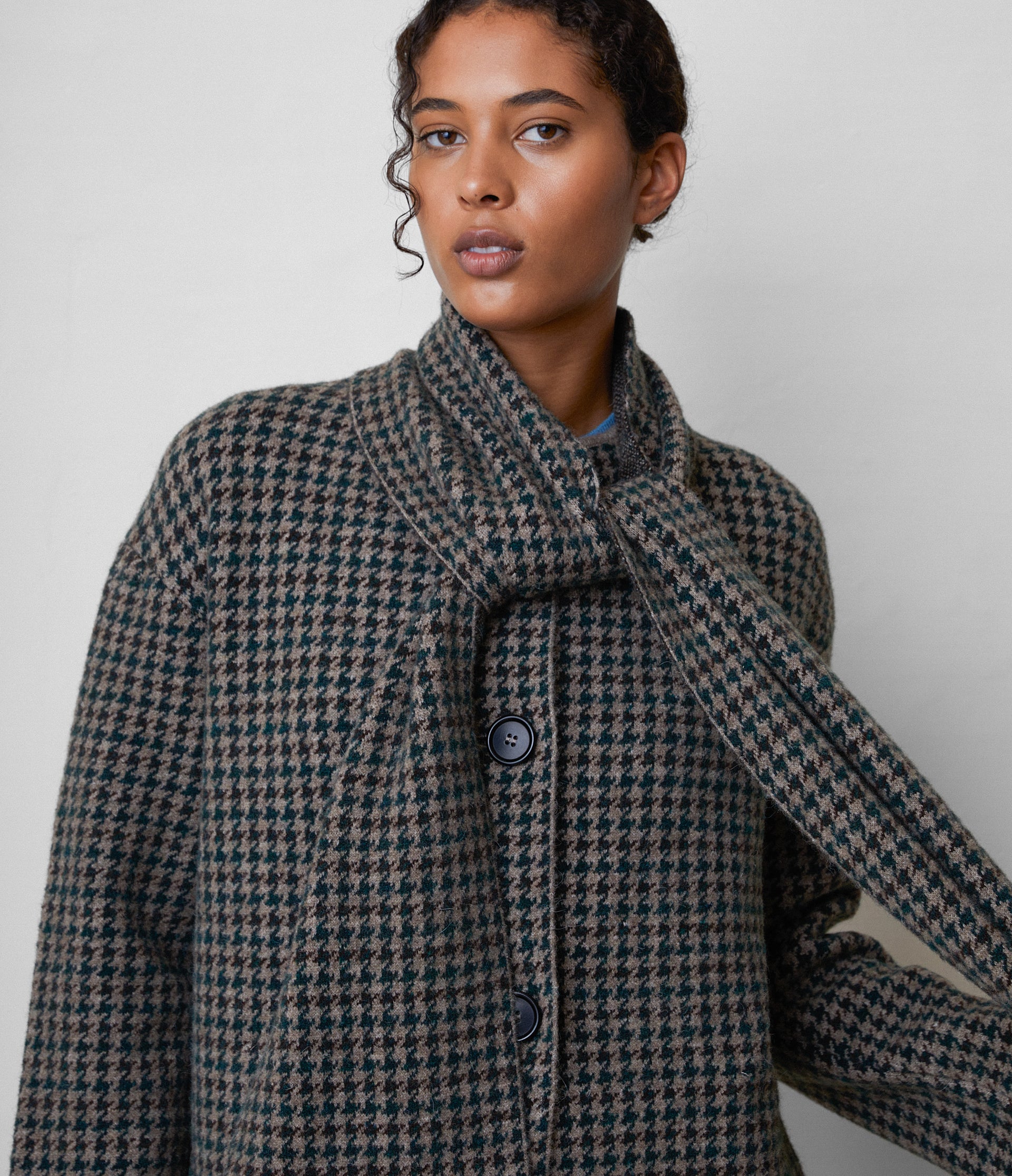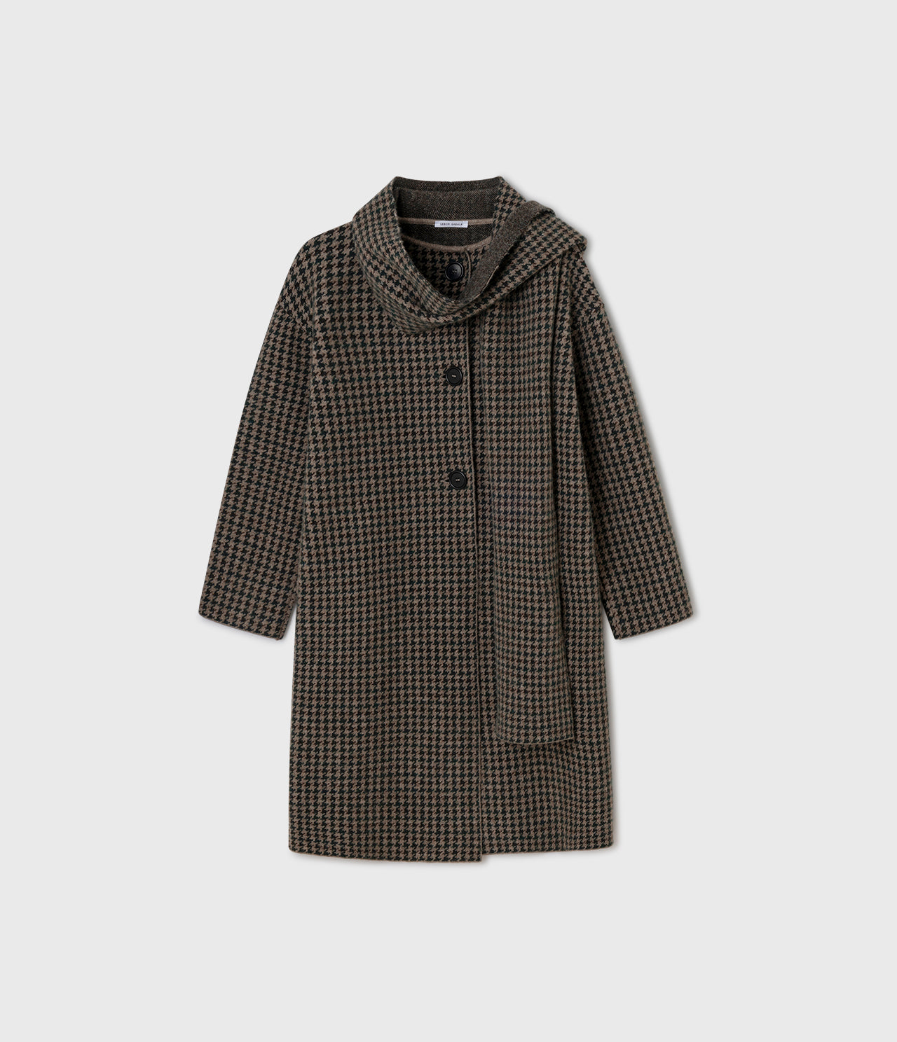 Houndstooth jacquard wool coat. Round neckline and front button closure. Attached scarf sewn at the back of the coat's collar. Side pockets.