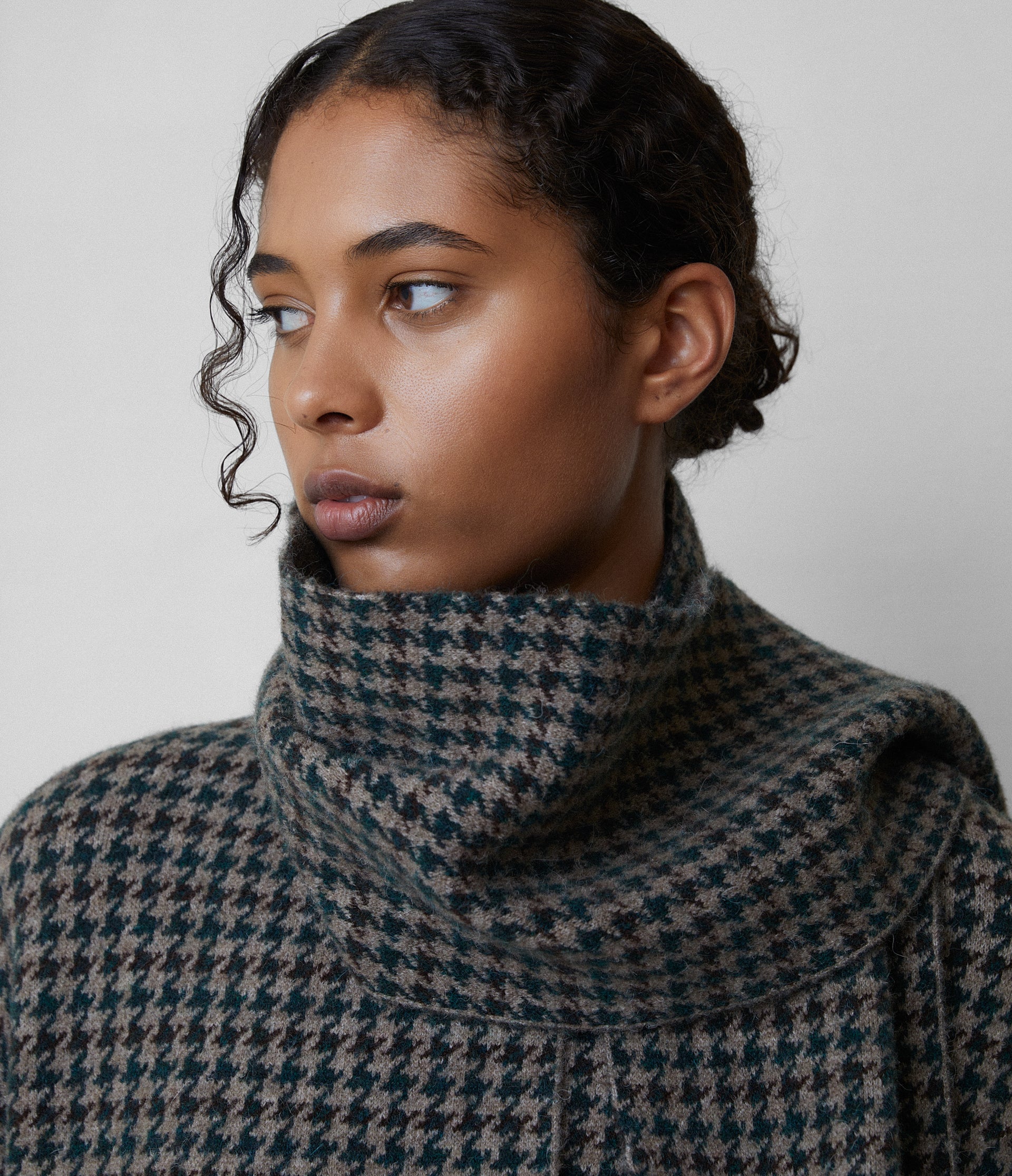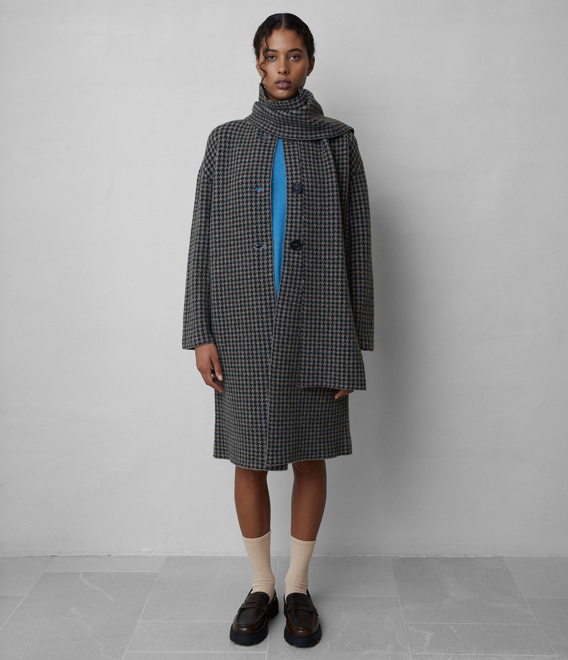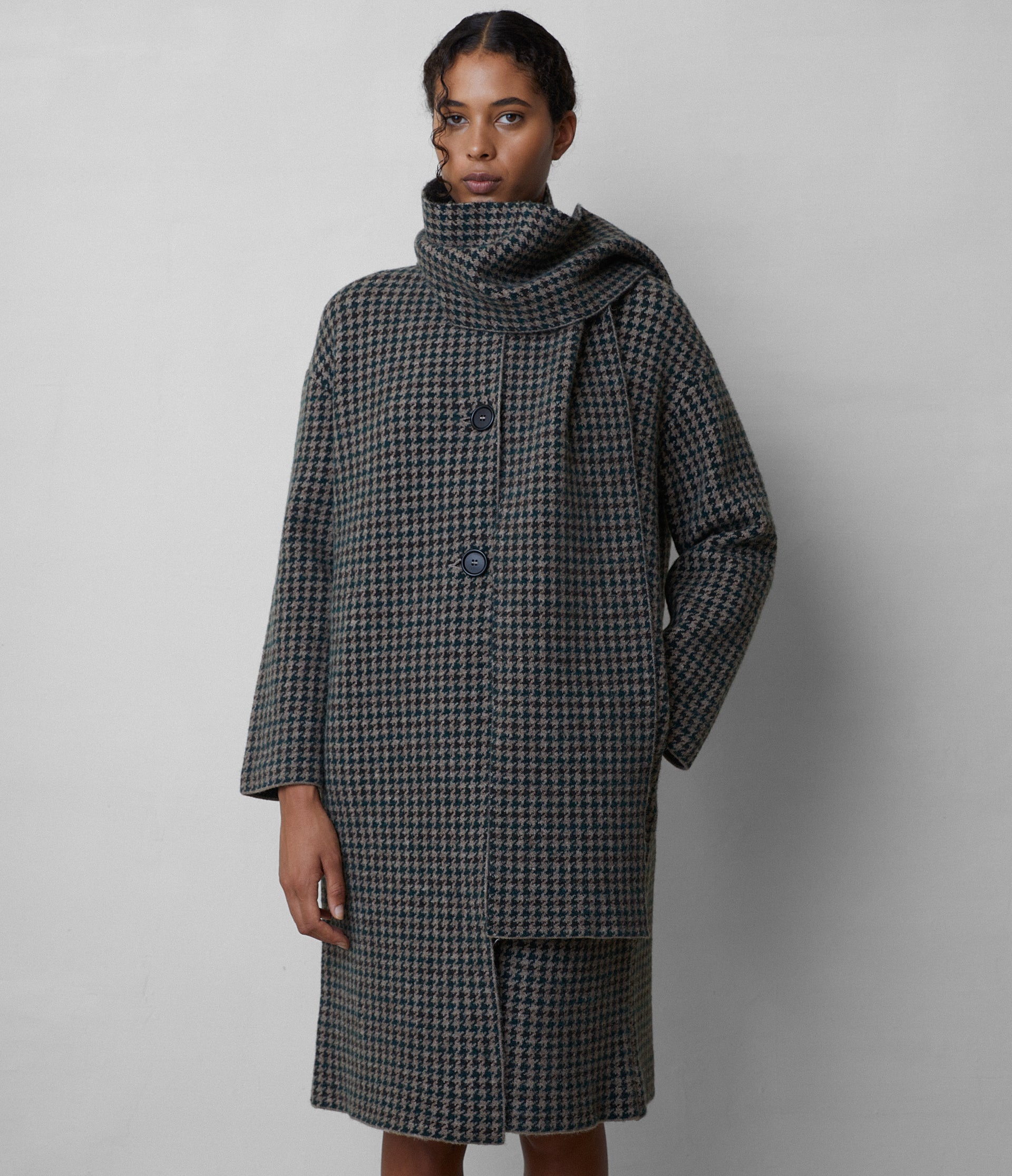 Houndstooth jacquard wool coat. Round neckline and front button closure. Attached scarf sewn at the back of the coat's collar. Side pockets.