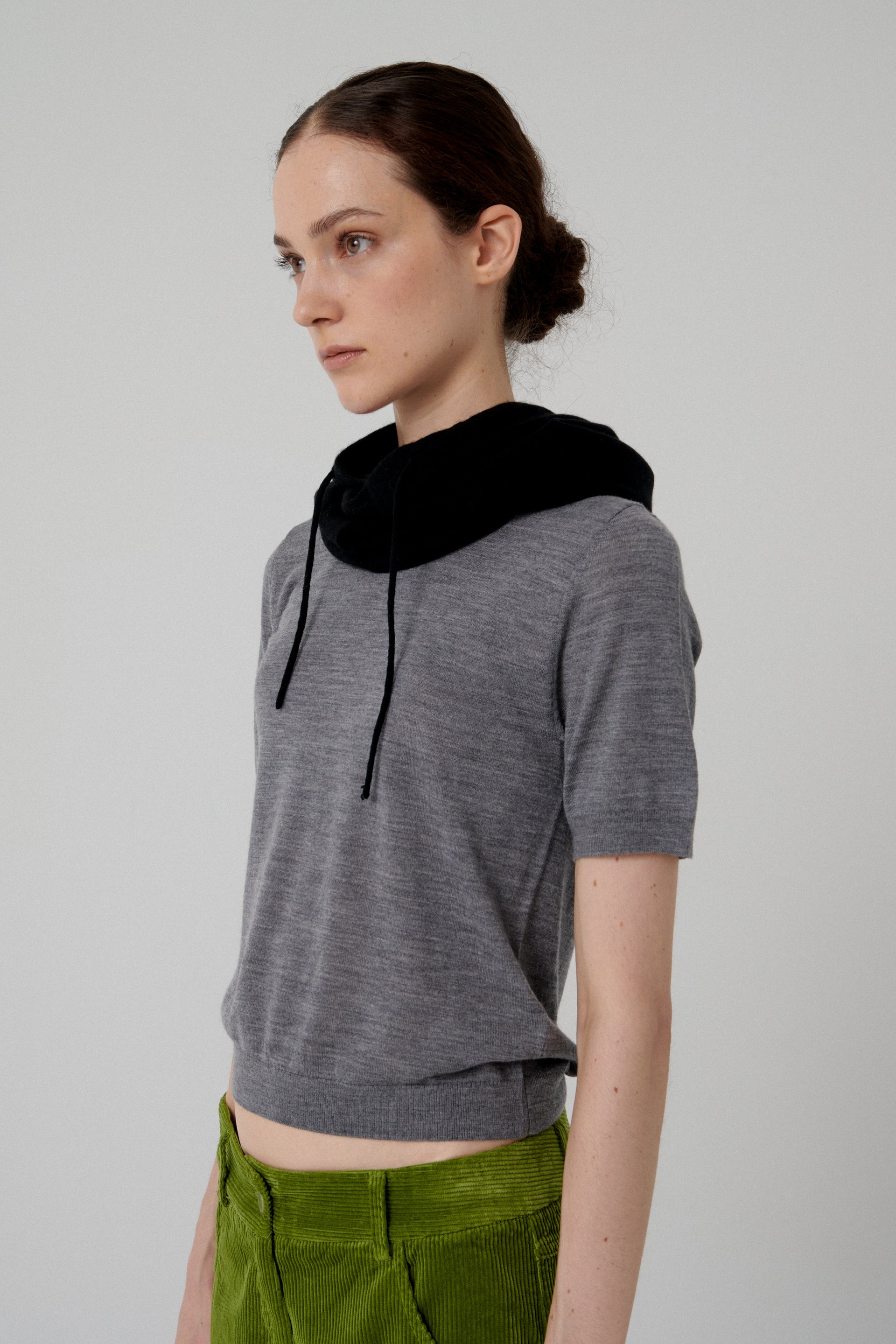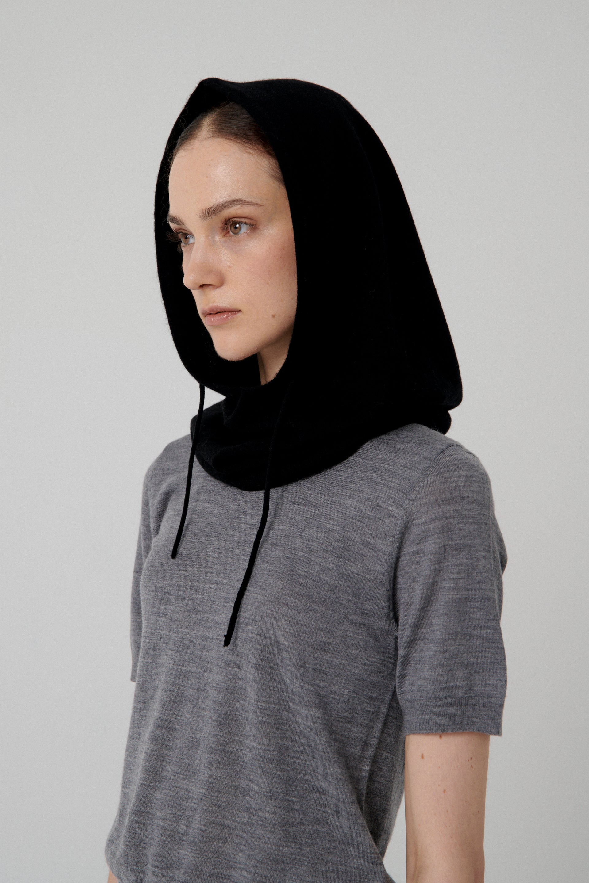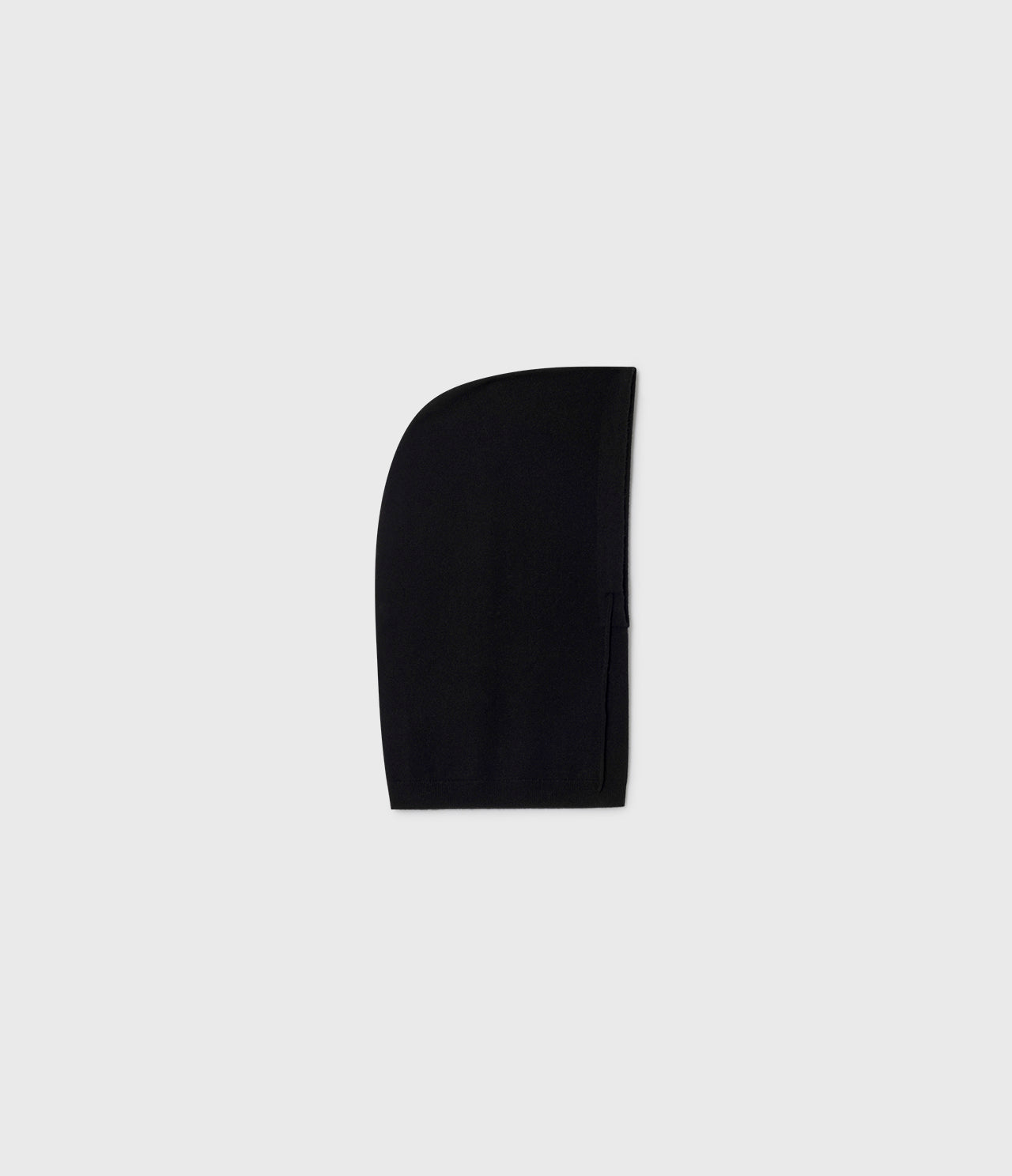 Knit hood in black featuring adjustable drawstrings.Made from a blend of mercerised wool and cashmere.