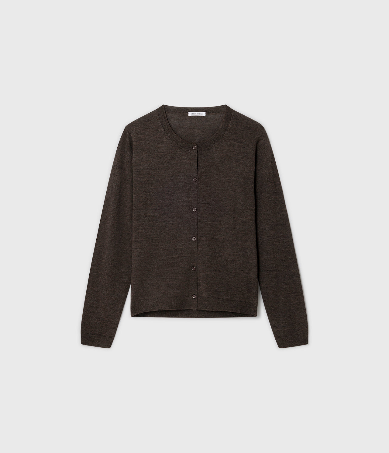 Short knit jacket in chocolate brown with a draped back, featuring ribbed cuffs, sleeves, and collar.Made from extra fine merino wool.