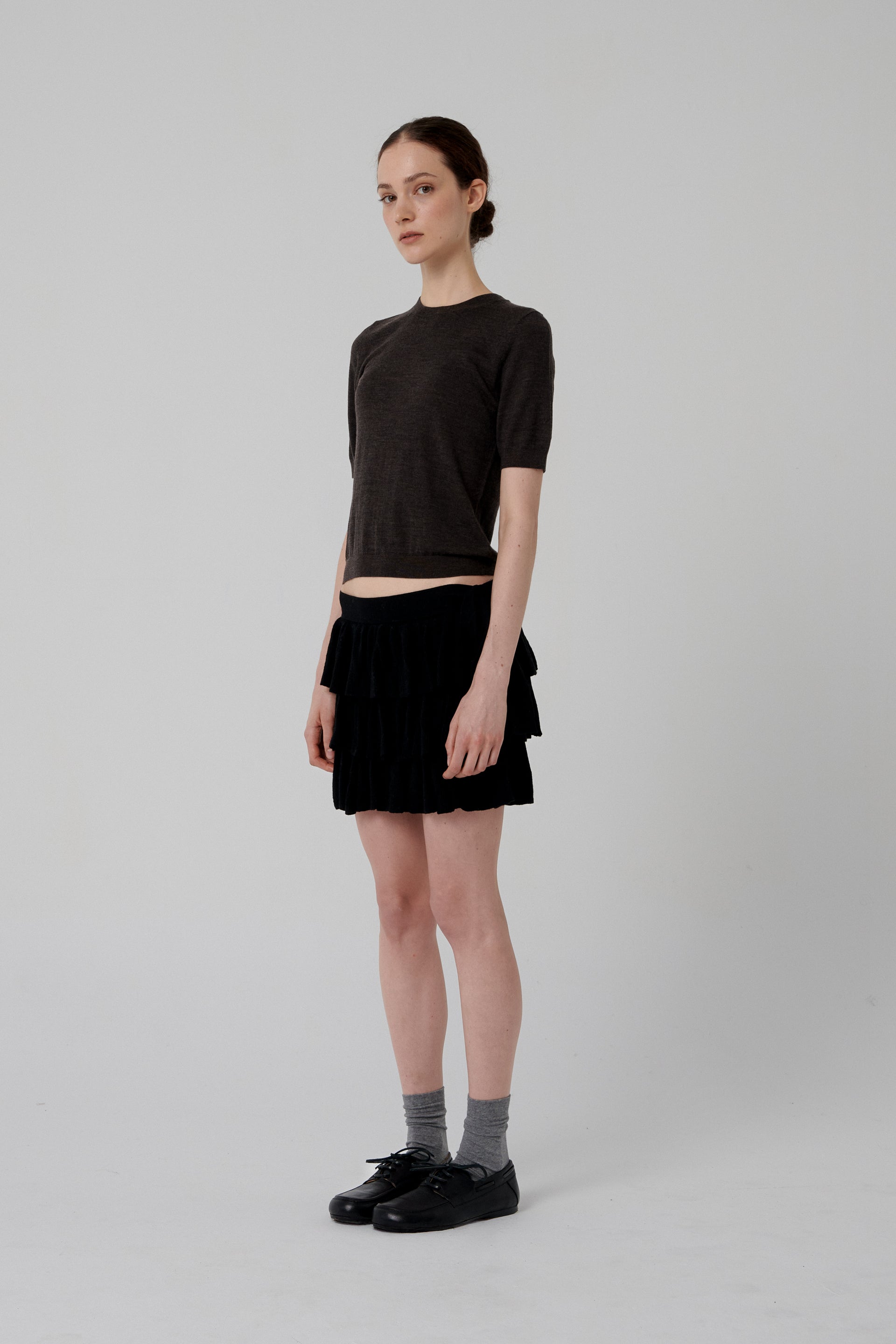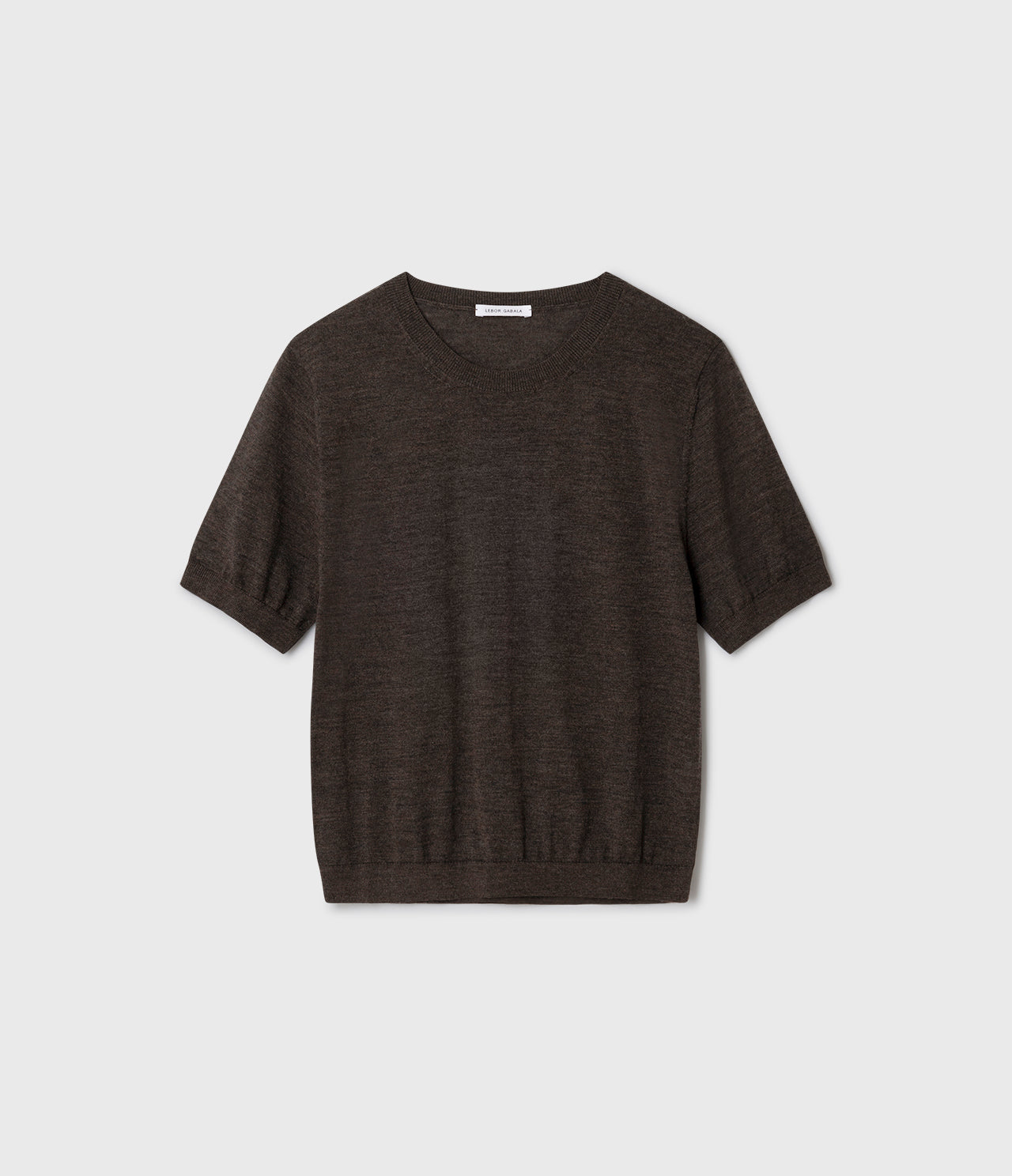 Short-sleeve knit t-shirt in brown with a round neckline, featuring ribbed collar, sleeves, and hem.Made from extra fine merino wool.