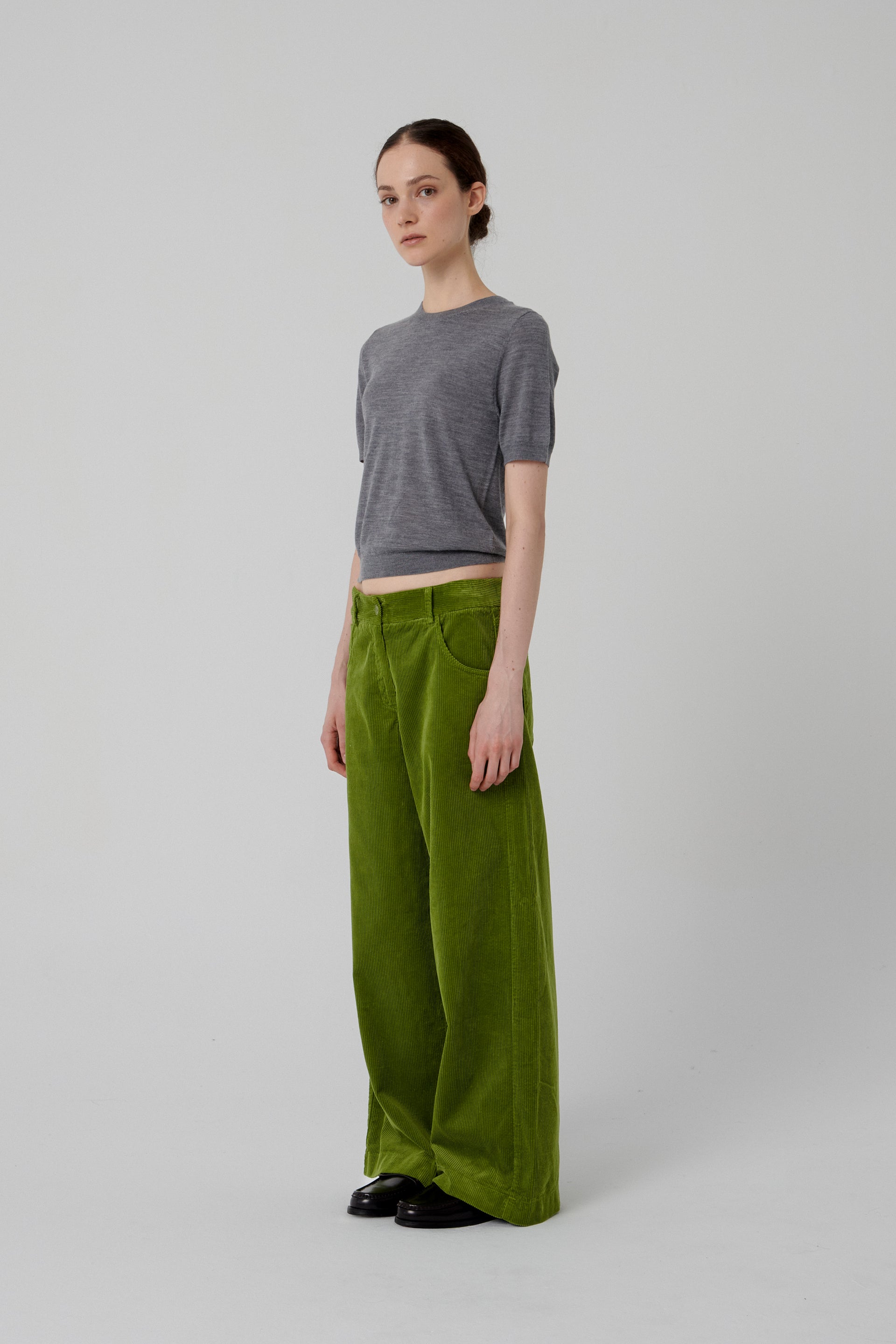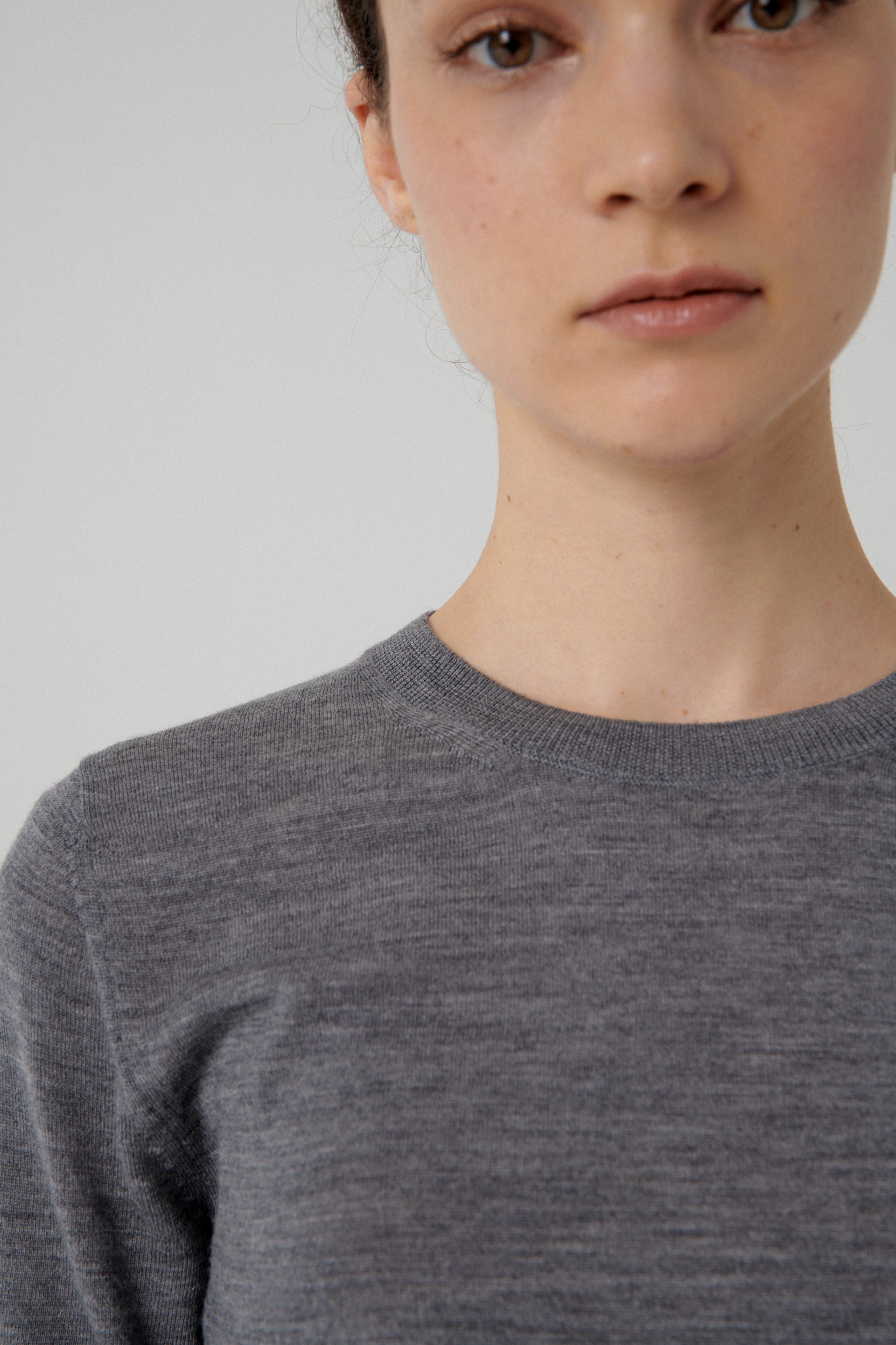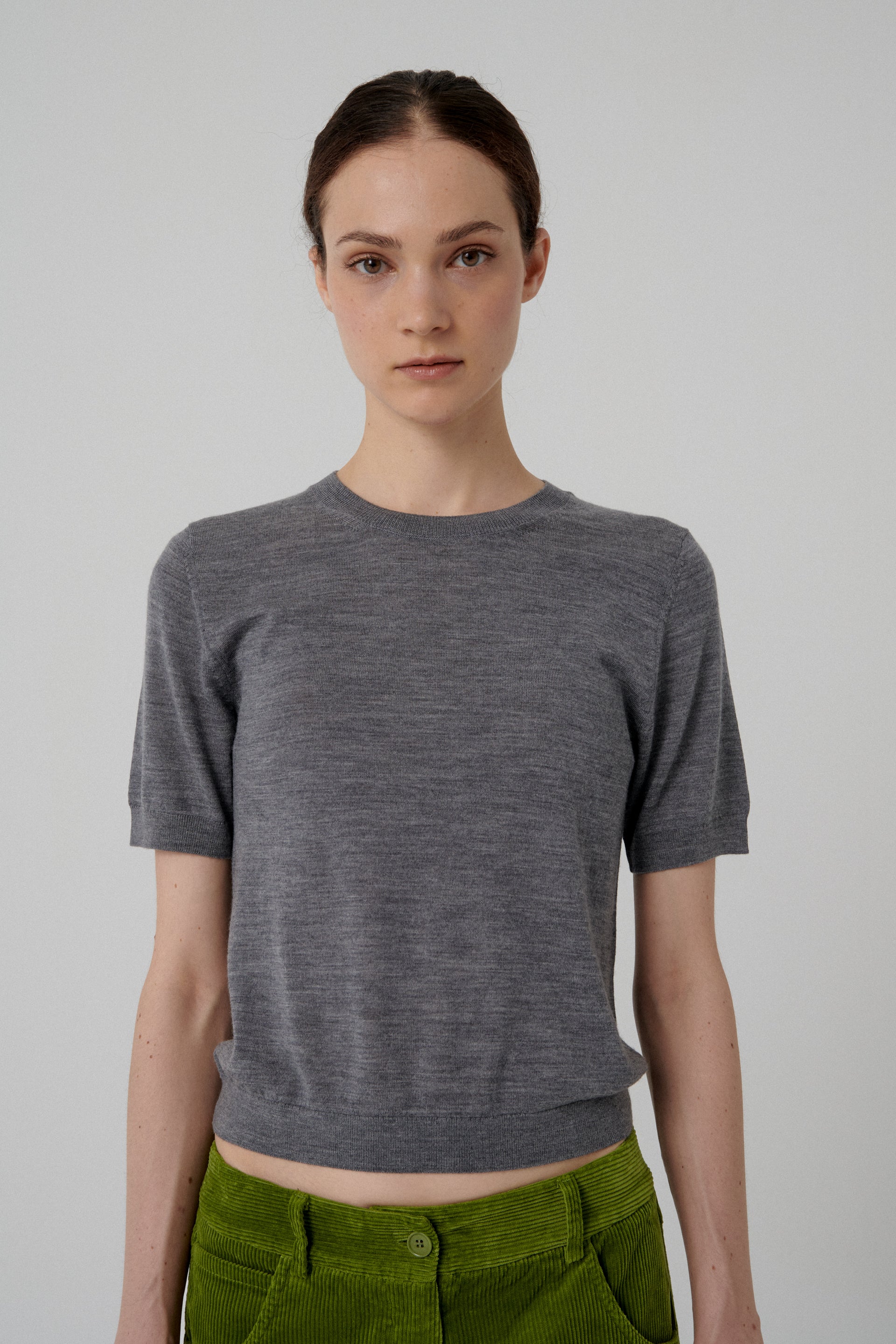 Short-sleeve knit t-shirt in grey with a round neckline, featuring ribbed collar, sleeves, and hem.Made from extra fine merino wool.