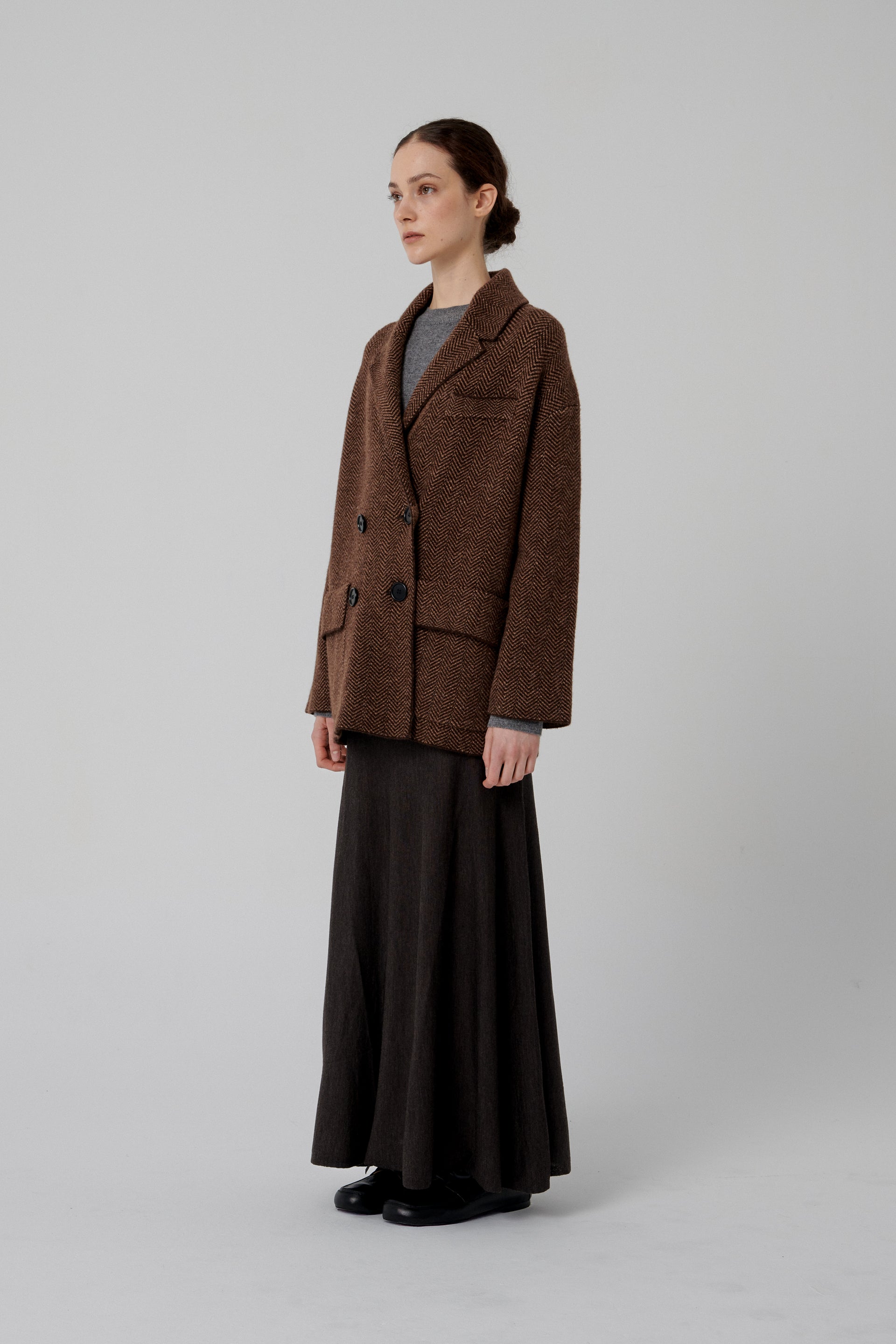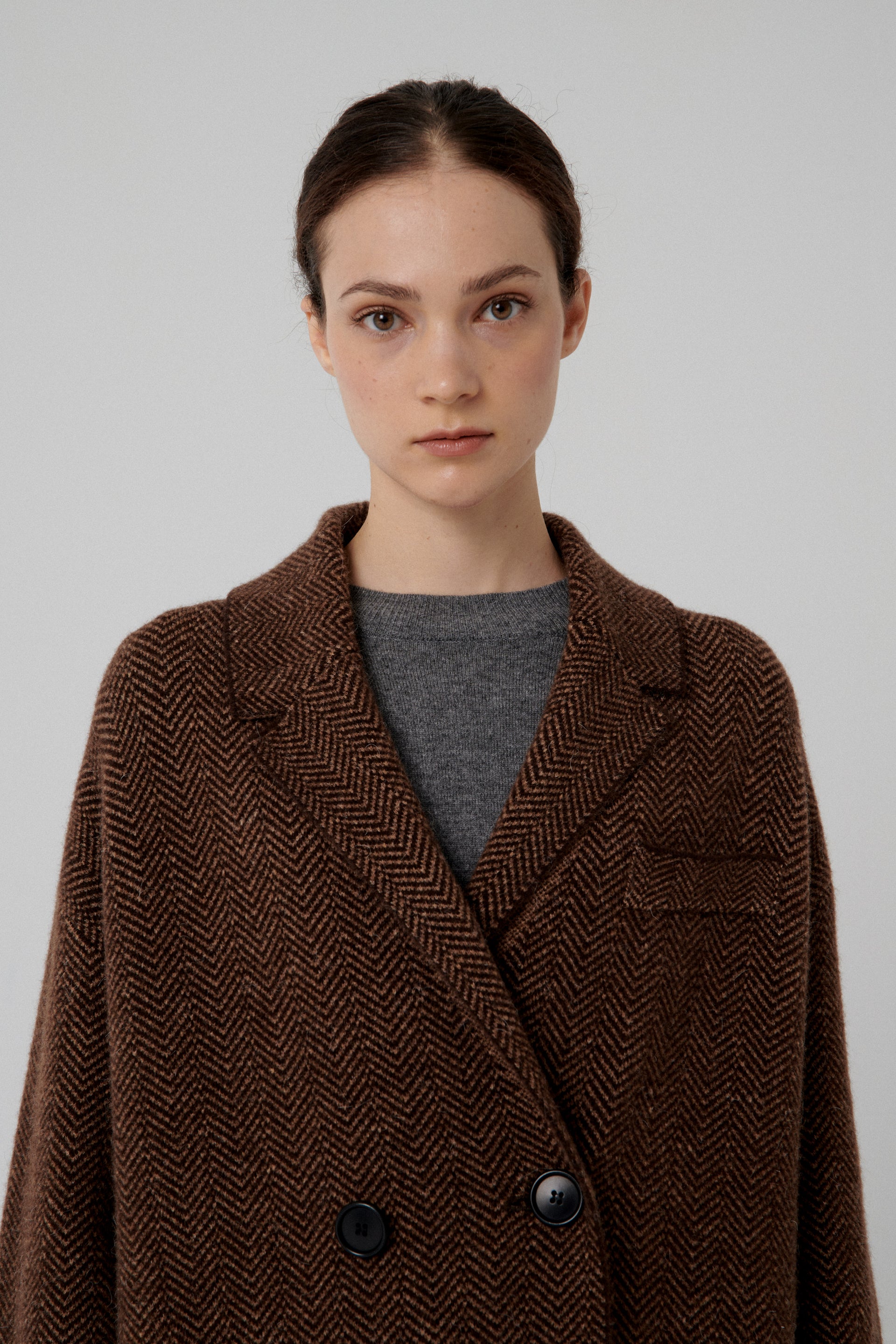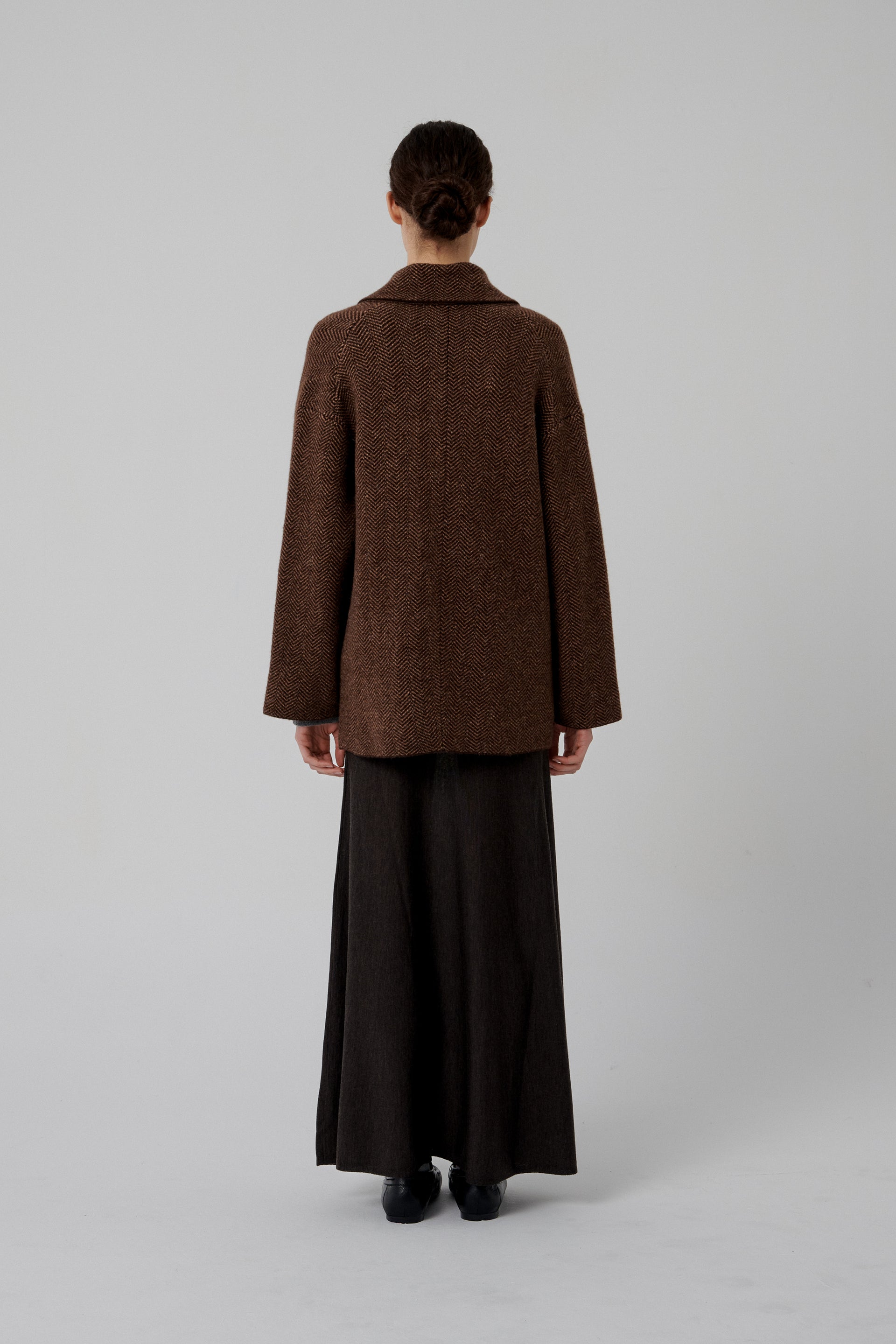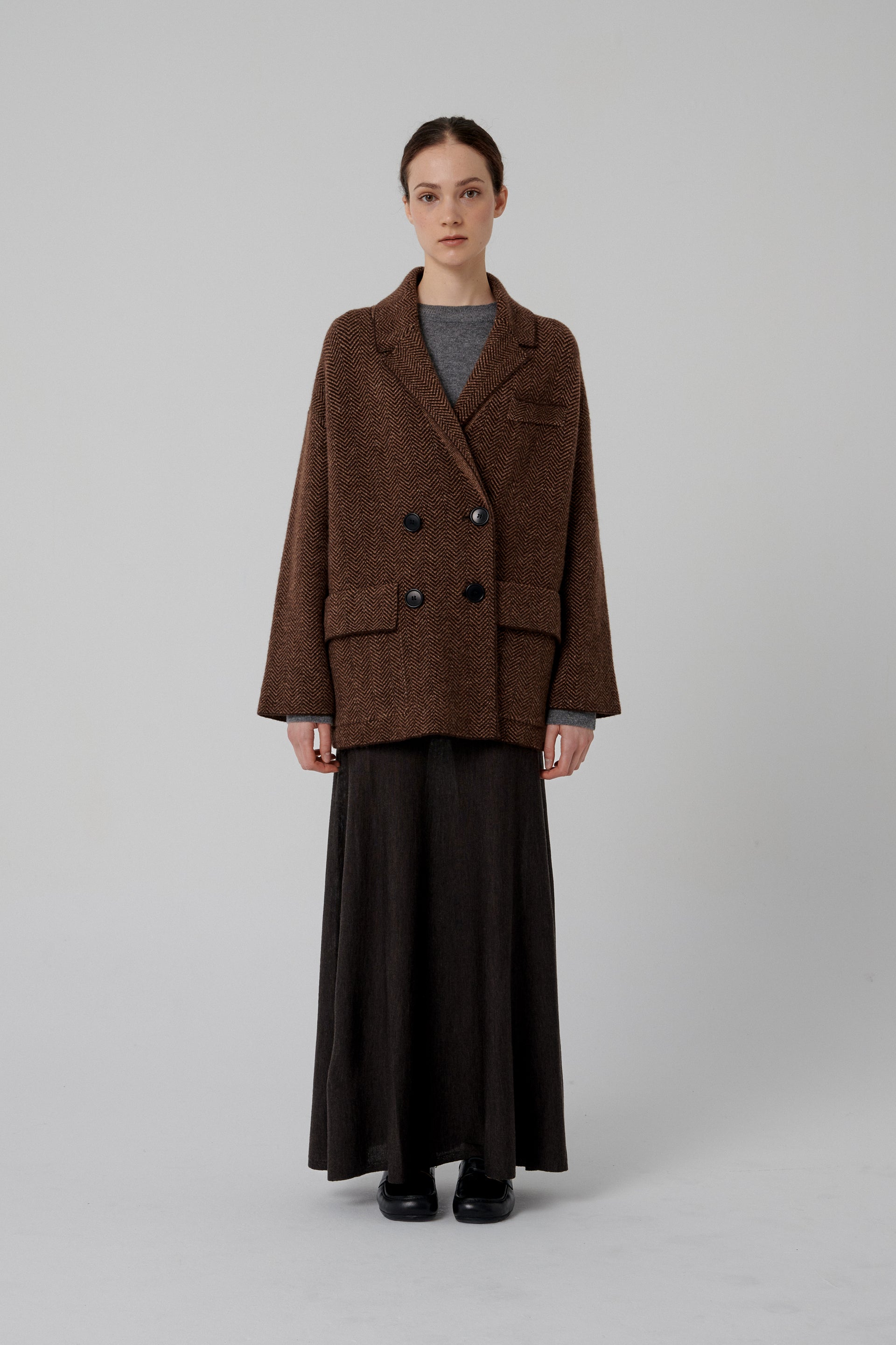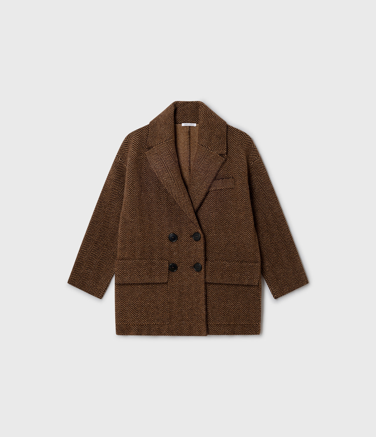 Double-breasted knit jacket in hazelnut herringbone, featuring front button fastening and a structured silhouette.