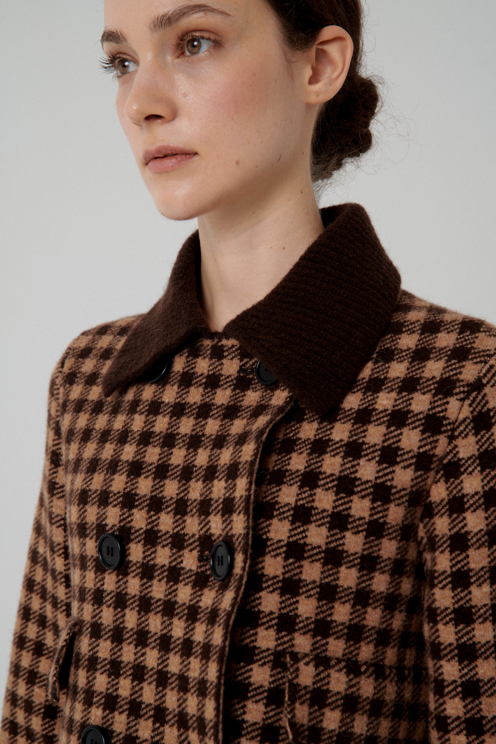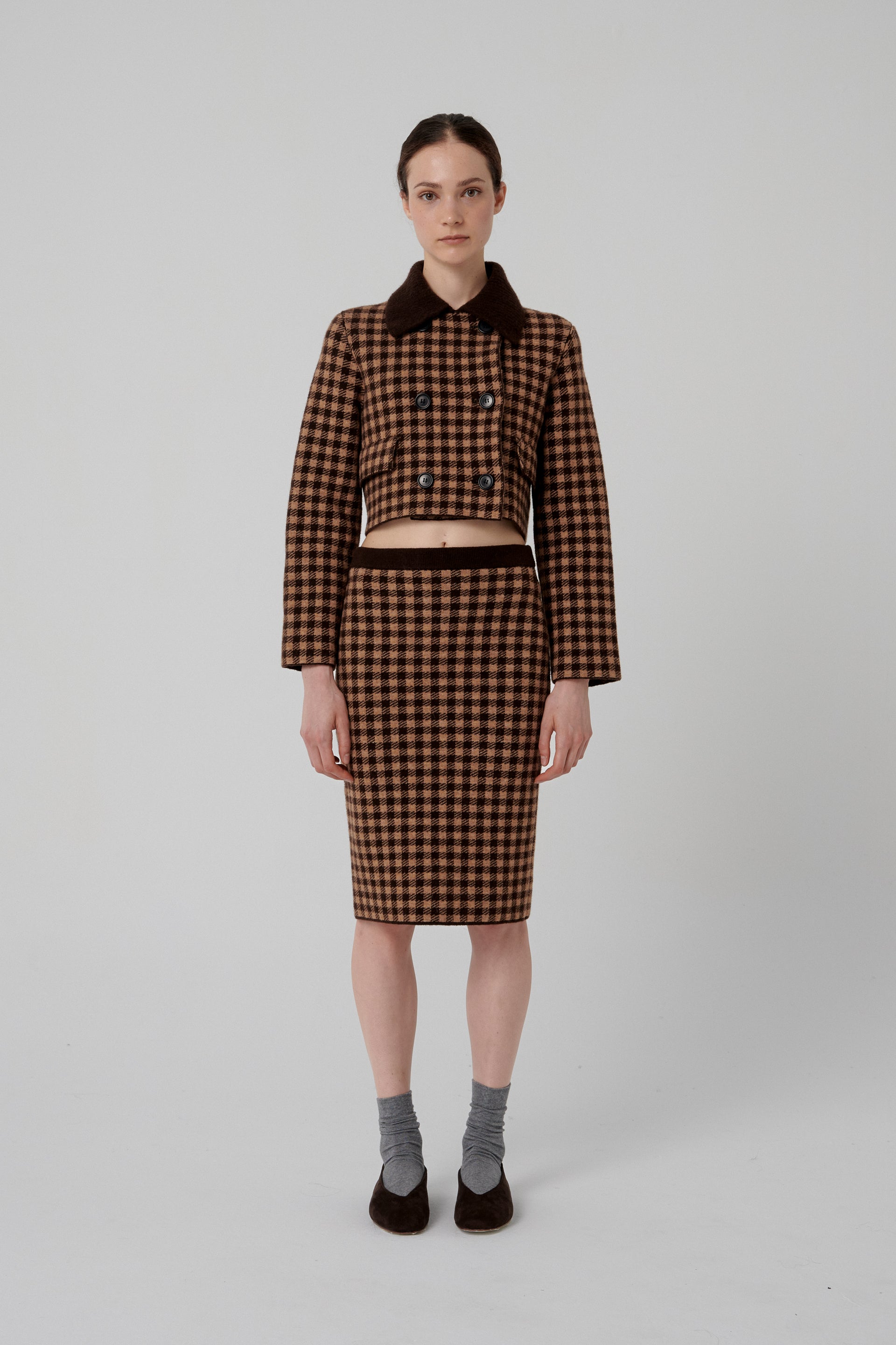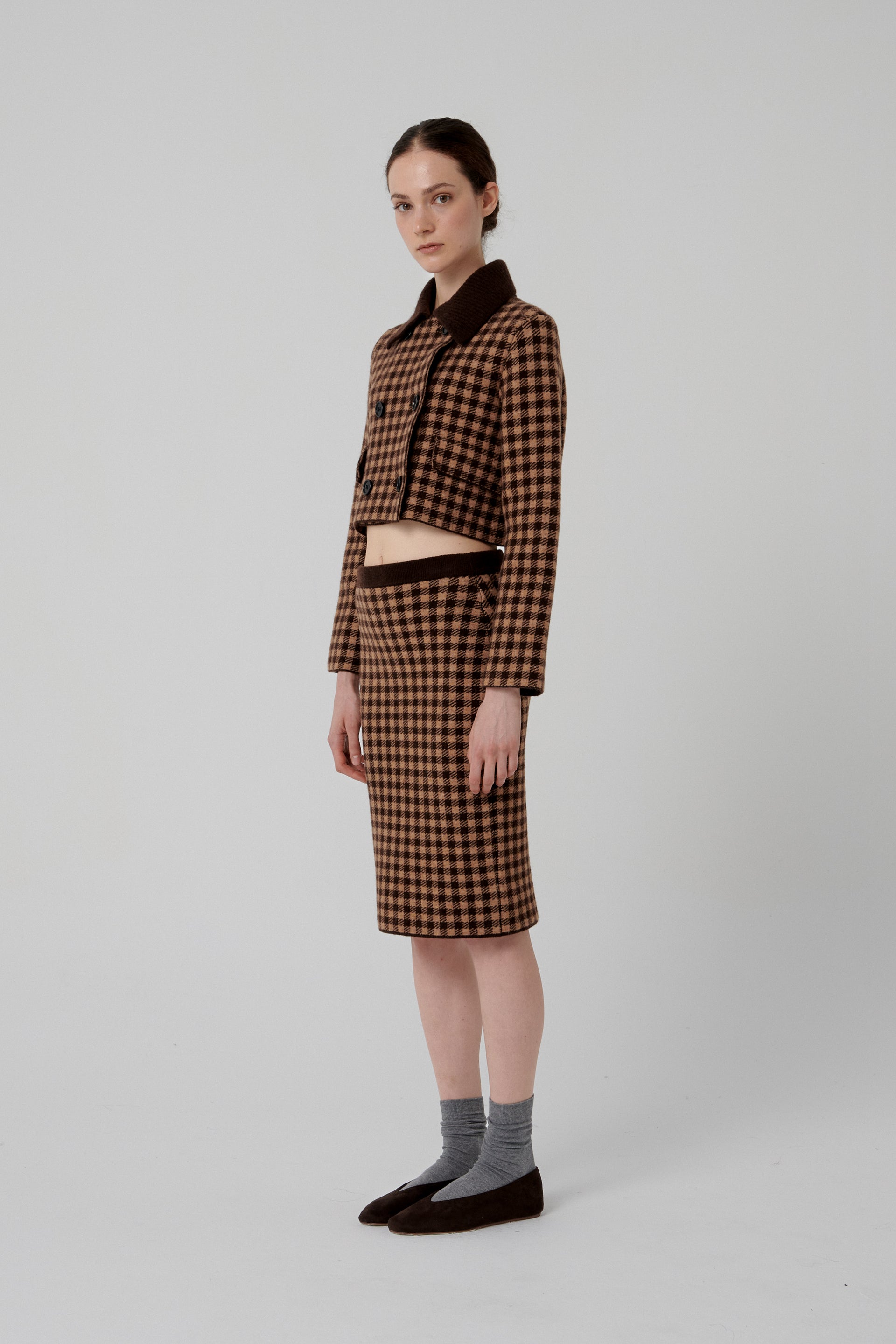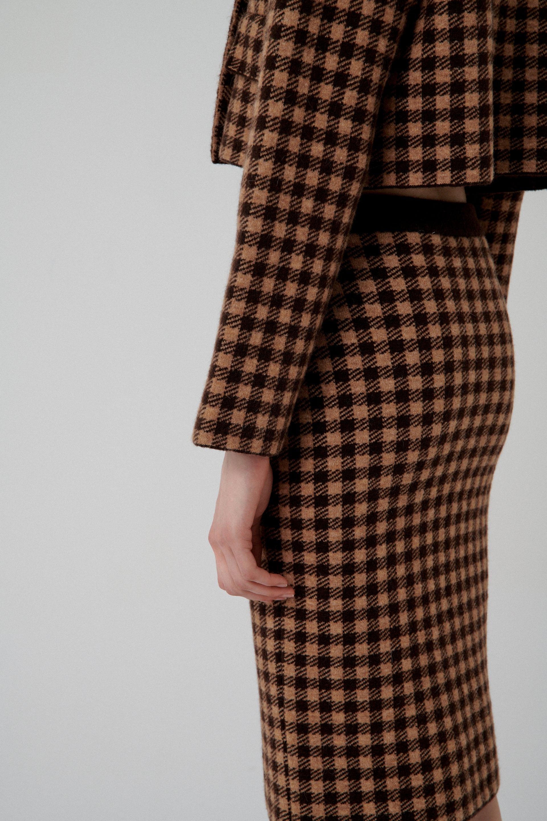 Midi pencil skirt with a ribbed waistband and vichy check pattern. Made from a wool-blend fabric.