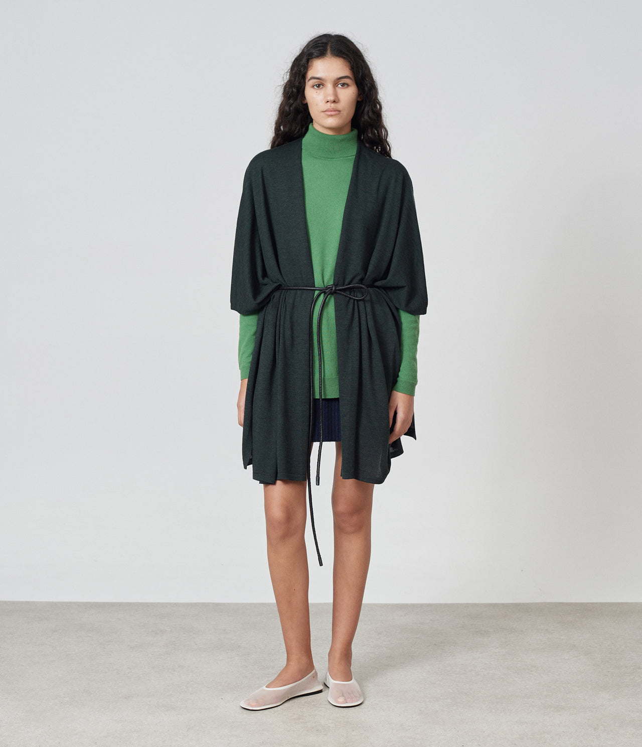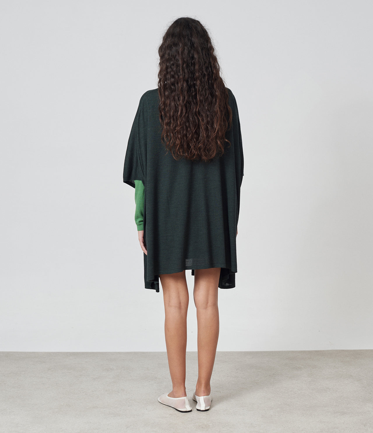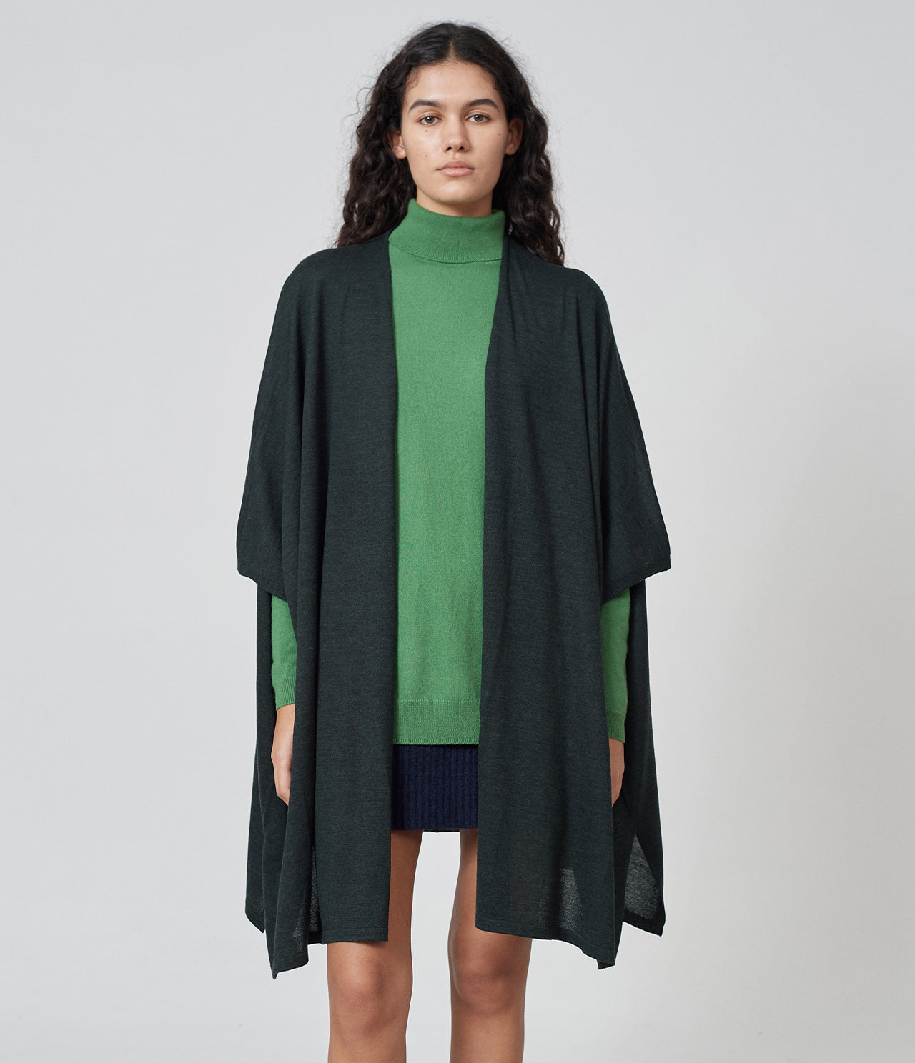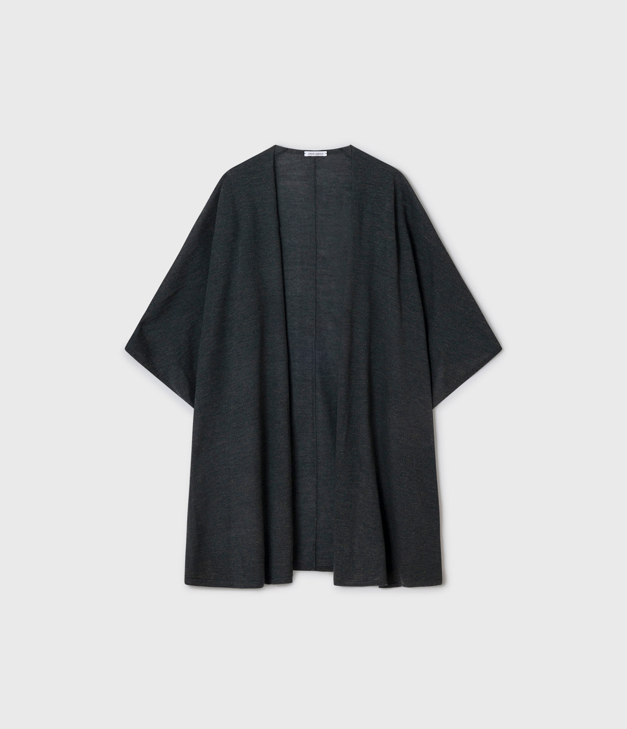 Open poncho with ¾ sleeves and fine knit. Hem with side openings. Sleeves and hem finished with a subtle ribbing.