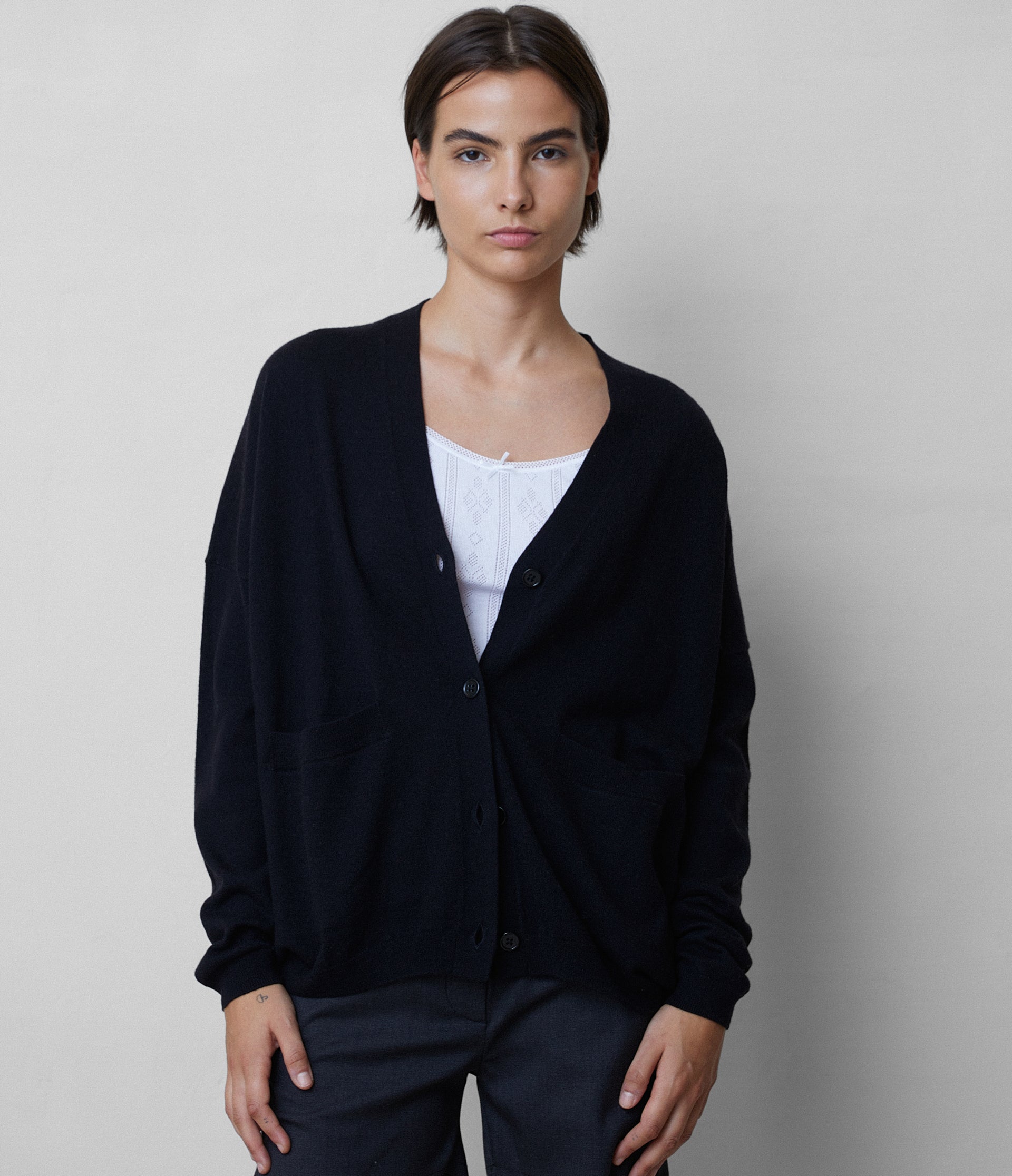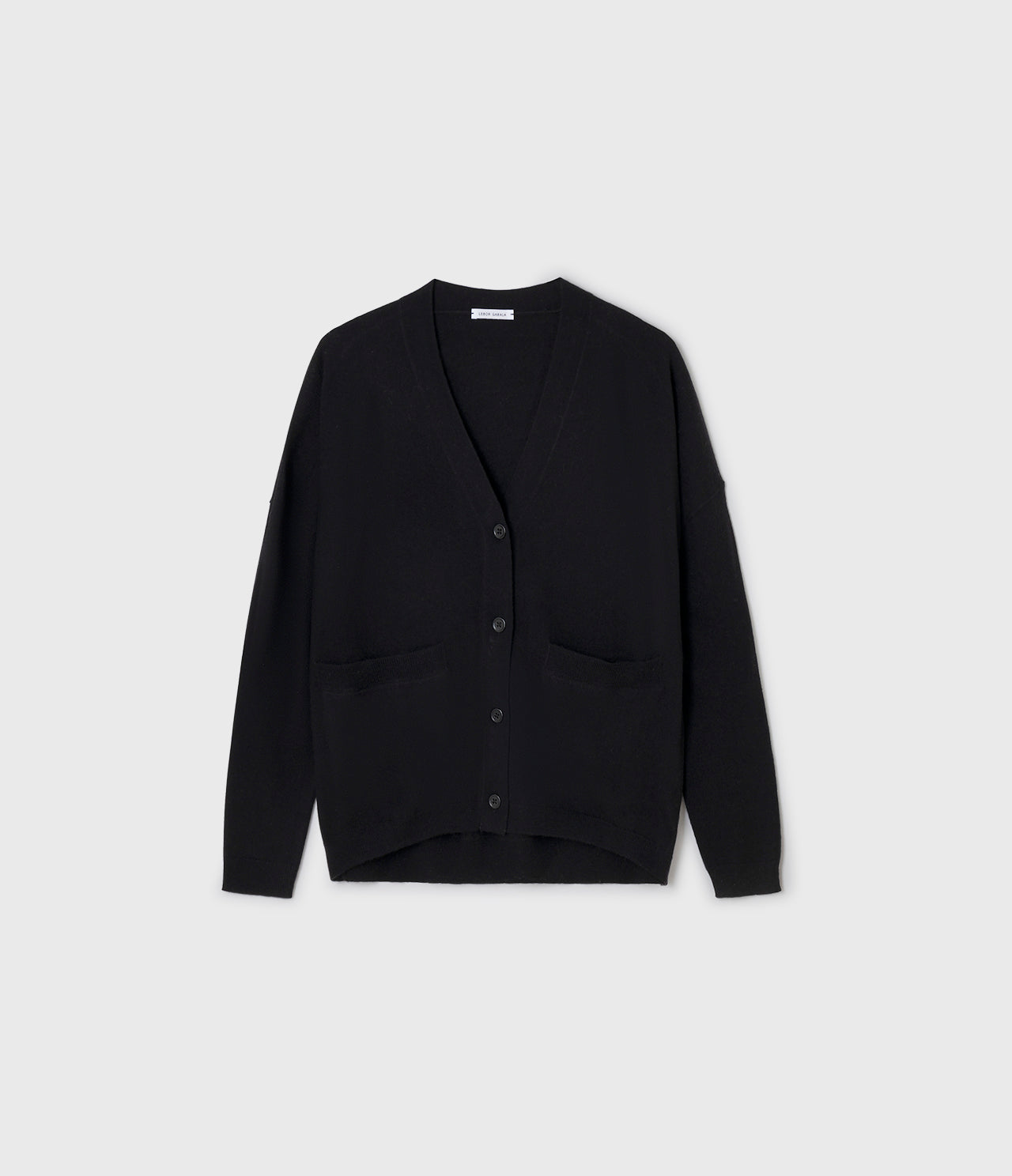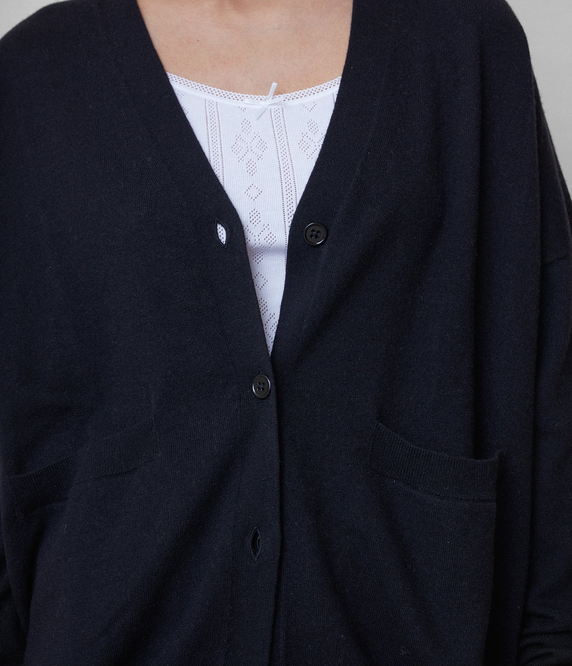 Knit cardigan with a V-neckline and dropped long sleeves. Front patch pockets and button closure. Ribbed finish on the cuffs and hem.