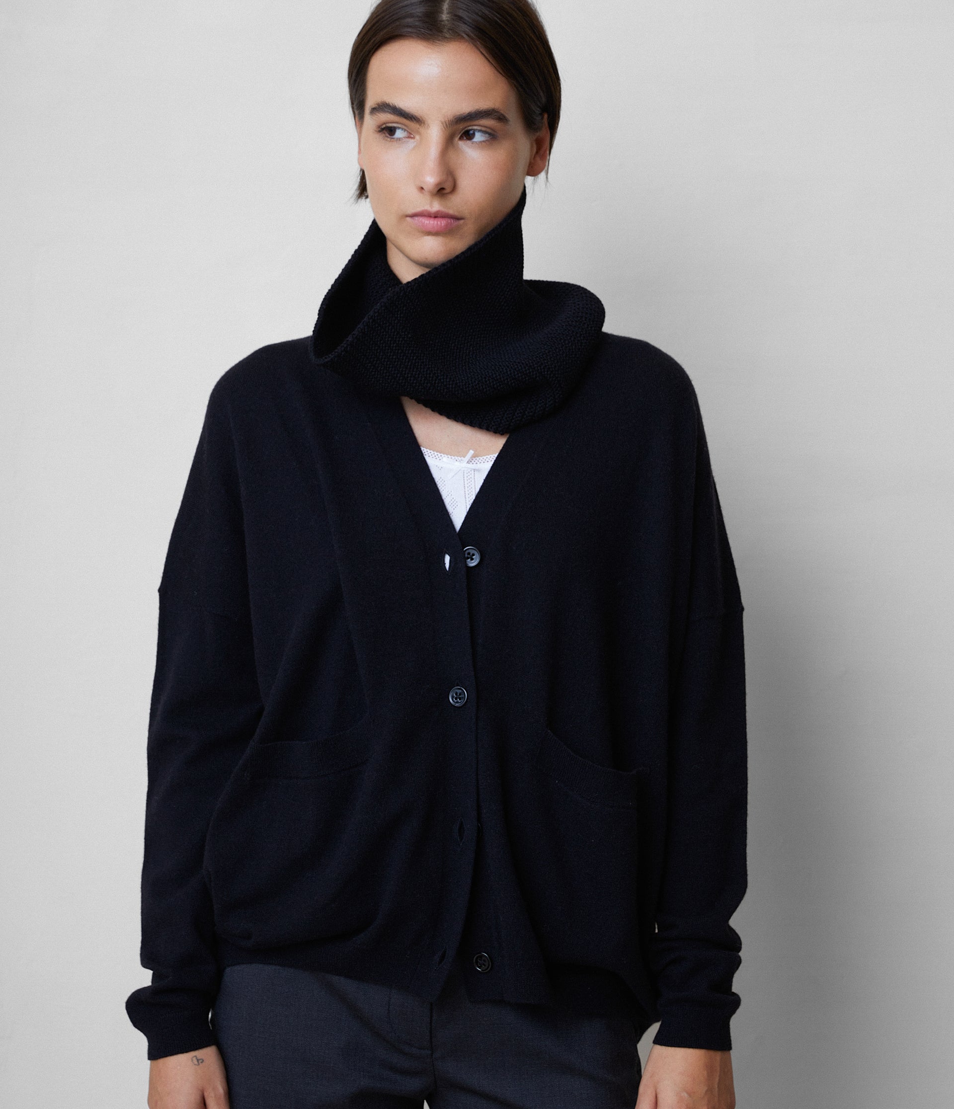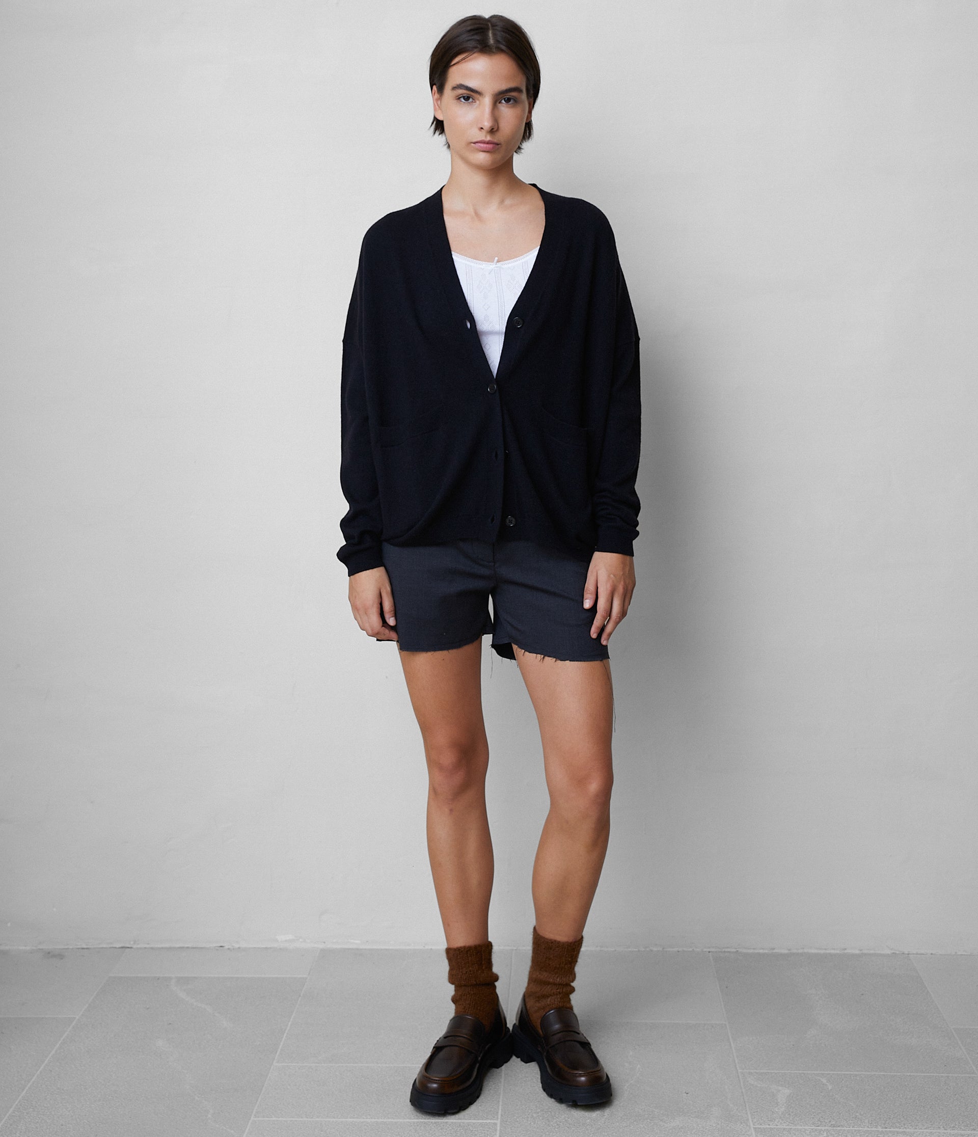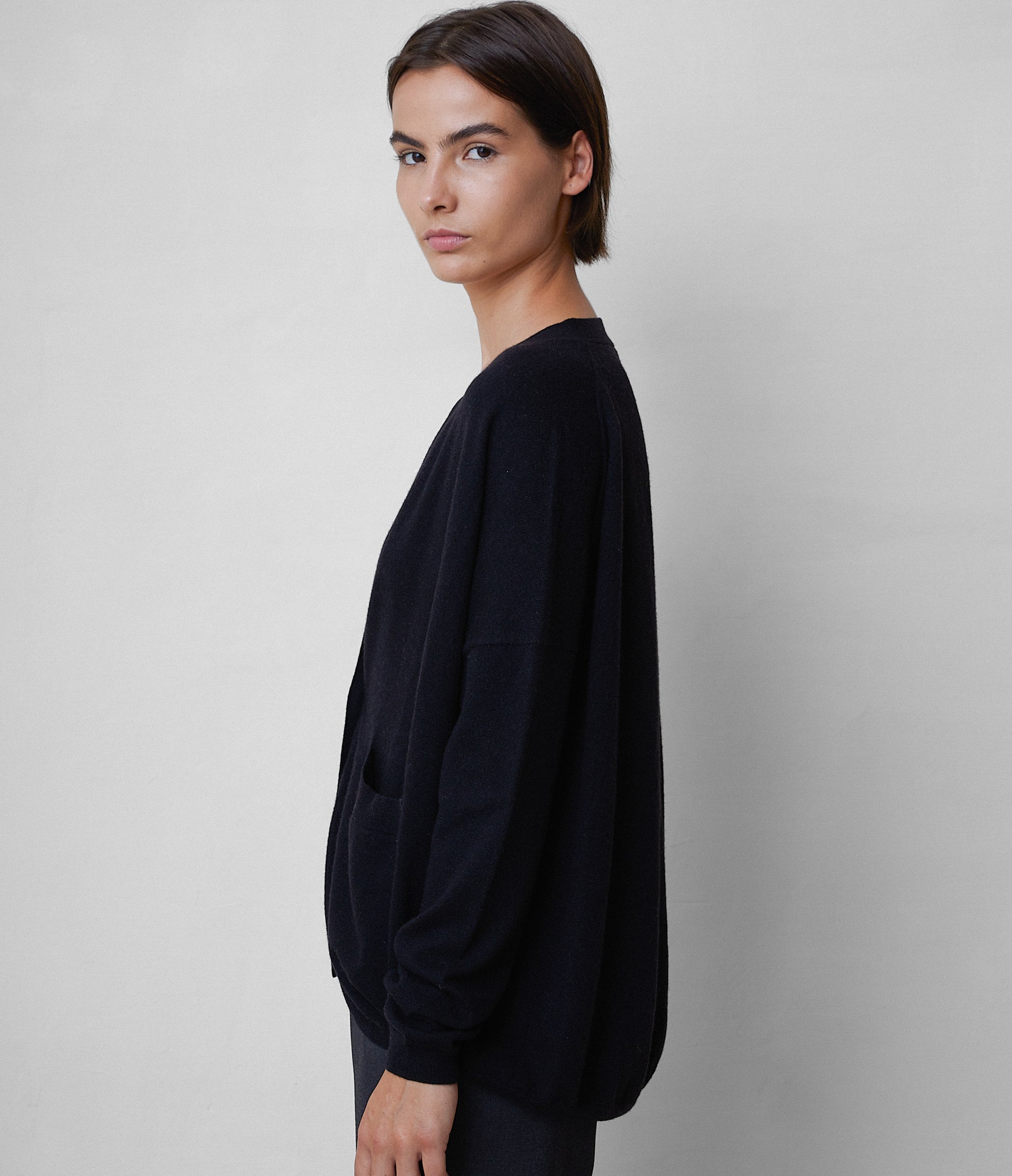 Knit cardigan with a V-neckline and dropped long sleeves. Front patch pockets and button closure. Ribbed finish on the cuffs and hem.